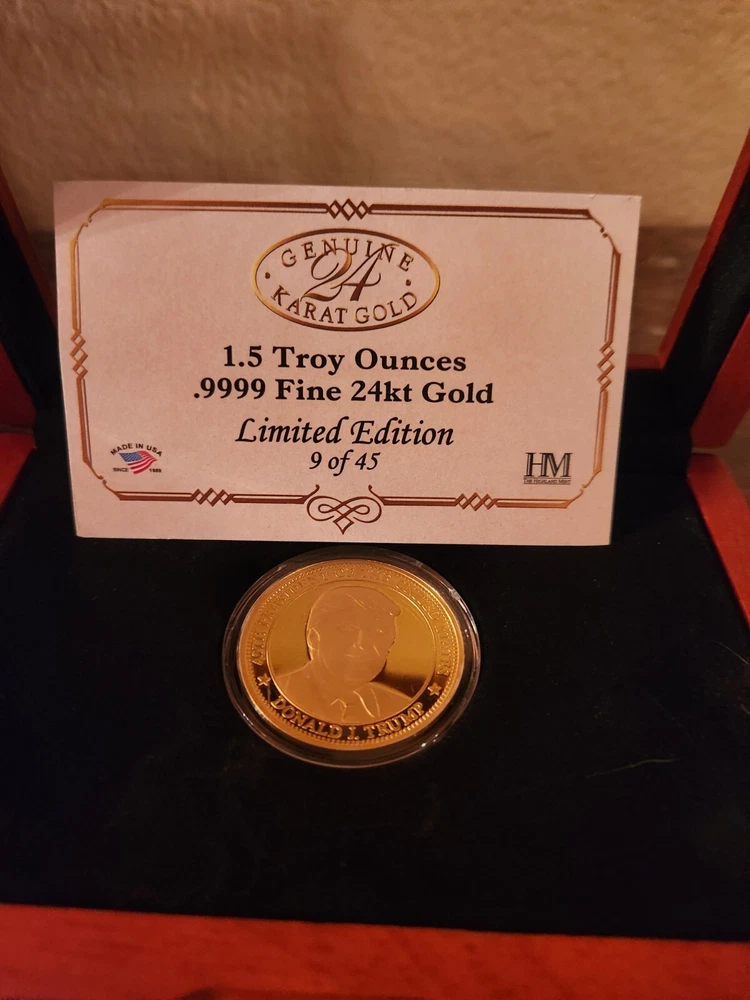 DONALD TRUMP 45TH PRESIDENT 1.5 TROY OUNCE GOLD COIN 9/45 WITH COA AND COMES WITH A WOODEN DISPLAY BOX