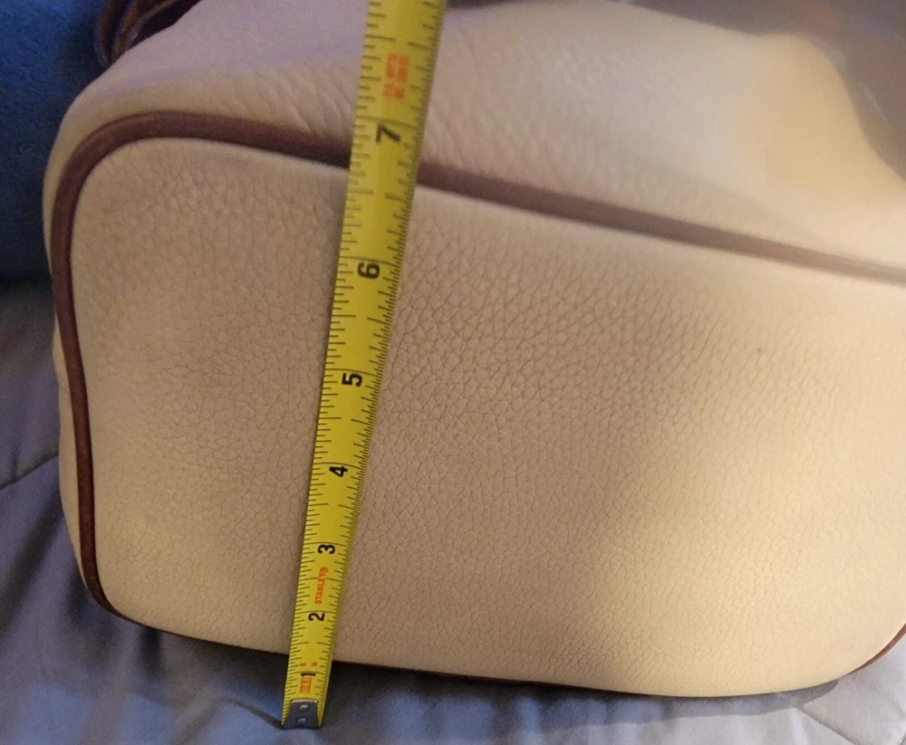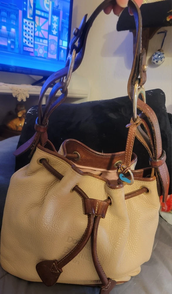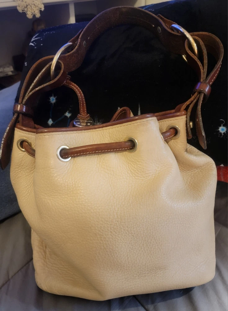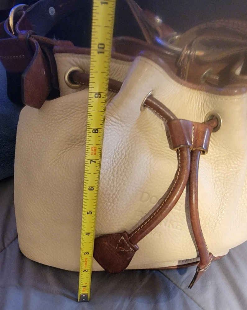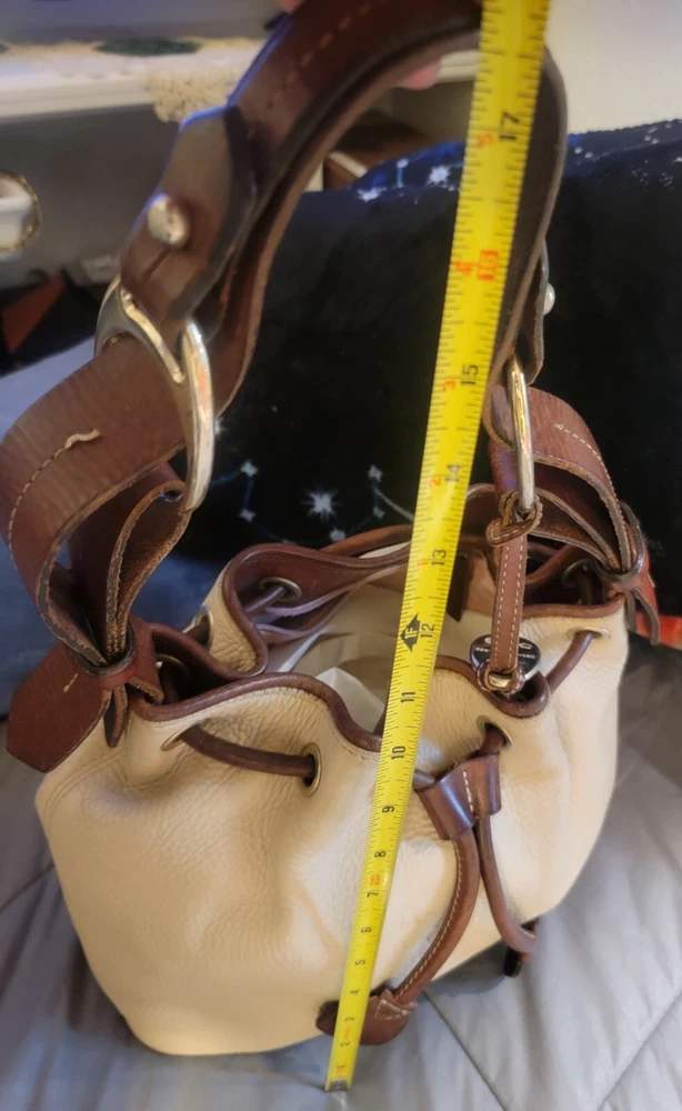 Elevate your style with this vintage bucket bag from Dooney & Bourke. The bag is made of high-quality leather with a pebbled finish and features a drawstring closure. The adjustable shoulder strap and brown handle/strap color add to its functionality and versatility. The gold hardware color and buckle accent give it a touch of elegance. This large-sized bag has a cylinder shape and measures 14in in width, 11in in height, and 5in in depth. It comes with a key holder and bag charm for added convenience. The red lining color and inner pockets make it easy to organize your essentials. The bag is waterproof and lined, making it suitable for all weather conditions.