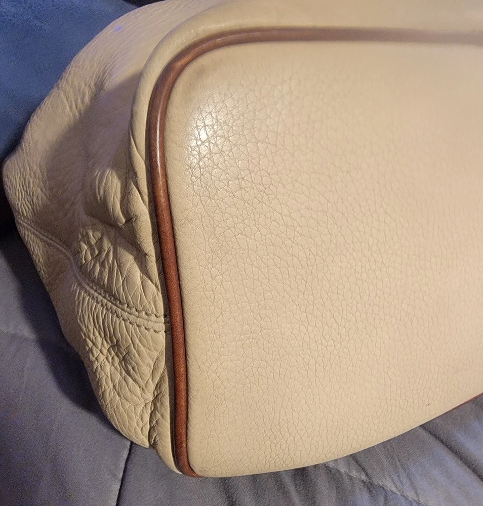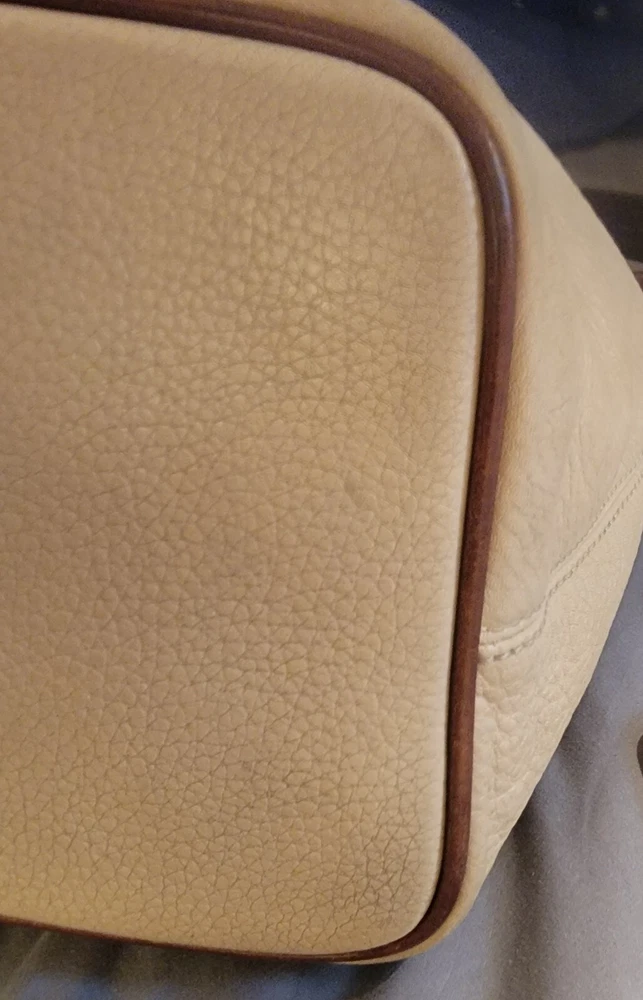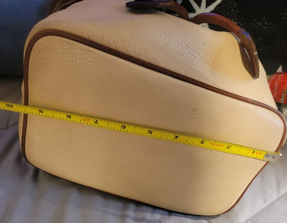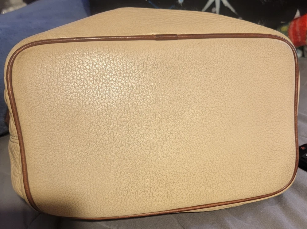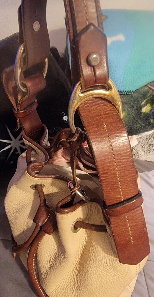 Elevate your style with this vintage bucket bag from Dooney & Bourke. The bag is made of high-quality leather with a pebbled finish and features a drawstring closure. The adjustable shoulder strap and brown handle/strap color add to its functionality and versatility. The gold hardware color and buckle accent give it a touch of elegance. This large-sized bag has a cylinder shape and measures 14in in width, 11in in height, and 5in in depth. It comes with a key holder and bag charm for added convenience. The red lining color and inner pockets make it easy to organize your essentials. The bag is waterproof and lined, making it suitable for all weather conditions.