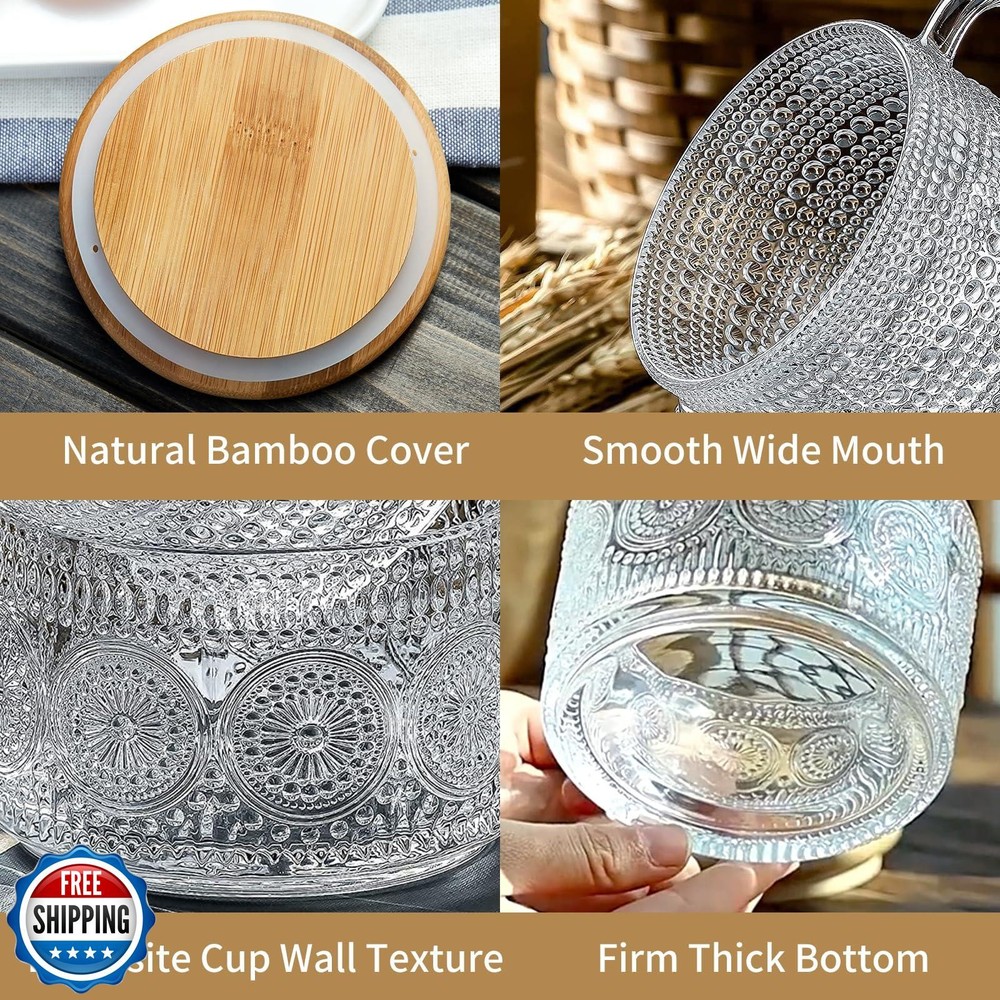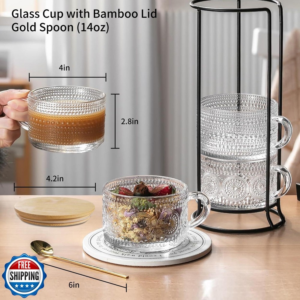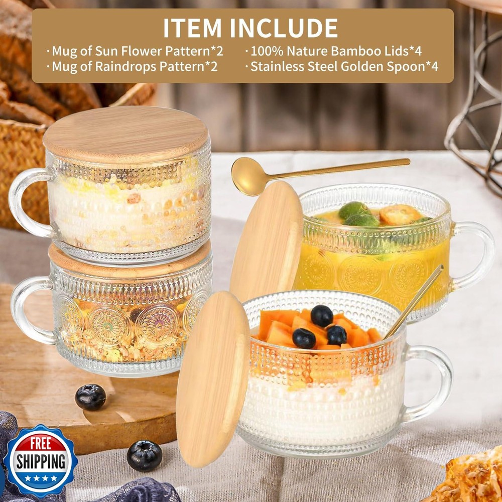 DOPUDO 4pcs Vintage Glass Coffee Mugs Cups, Overnight Oats Containers Glass Cups Mugs with Bamboo Lids and Spoons - 14oz Clear Embossed Glass Cups, Cute Iced Coffee Glasses Gifts for women Features PRODUCT INCLUDES: 4 vintage coffee mugs that 2 embossed with sunflower patterns, and 2 with raindrops patterns, 4 rose-gold spoons, 4 100%-nature-bamboo sealed lids. Elegant and high-end outlook embellished with graceful designs, but meanwhile still being very practical of the combination. FULL OF VINTAGE AESTHETIC DESIGN: Classic mug-shape but in crystal glass has a delicate round curved handle. 2 sunflower patterned ones have fancy mandala-like borders decorated around like pendants. The rain-dots regularly arranged with different sizes that has a taste of a typical retro trend, making them all go well with every drinks matches with the metal spoons and bamboo lids even just with water giving your table out of plain styles and full of elegant old fashion ways. SAFE, DURABLE AND LARGE CAPACITY: The drinking glasses are made of premium durable transparent glass, thicker than ordinary jars glass that enhance it to be more durable. Lead-free, BPA-free and totally food safe. Large capacity of 14oz. Great for any hot and cold drinks and widely loved by families, restaurants, cafes and bars. A very excellent choice to make overnight oats, iced coffee, cappuccino, latte, cereal, yogurt, smoothie, fruit juice, tea or any other interesting holiday drinks. AMAZING GIFT: These irish coffee glasses and accessories are all exquisite handcrafted and well made. It would be a perfect and charming gift choice for Housewarming, Birthday, Dad’s Day, Mother’s Day, Christmas and Thanksgiving Day gifts. Surprise your beloved ones with this fancy gift and they will love it to no end. SECURELY BOXED: Glasses Sets come securely bubble wrapped in a thick box, so any gifting plans will be a success! If the glass set you received was damaged or imperfect or you are not 100% satisfied, please simply contact us, we will offer a satisfactory solution. USE FOR NOTE: Prohibited to use in the microwave oven and dishwasher. DON'T USE IN THE MICROWAVE OVEN AND DISHWASHER .Avoid pouring boiling water directly into the cup to prolong the service life of the mug. Shipping Free & Fast Shipping: We offer free shipping to most of the USA with a normal delivery time of 3-7 days. However, due to the current situation, additional delivery time (up to 3 weeks) may be required for some items. Alternative Carriers: We may use alternative carriers (e.g., USPS, FedEx, UPS) to ensure your package arrives safely and on time. Due to the use of multiple carriers, we are unable to provide a tracking number automatically. Handling Time: Orders are processed and shipped within 1-2 business days of receiving cleared payment. Shipping Restrictions: Shipping to Alaska, Hawaii, Puerto Rico, Guam, and other US territories may incur shipping charges or delivery restrictions. Please contact us before ordering, or your order can be refunded/cancelled. State Restrictions: Certain items may not be shipped to California due to state regulations. Contact for Tracking Updates: If you require tracking updates or have any concerns about the delivery of your order, please feel free to contact us, and we will be happy to assist you. Return Policy 30-Day Hassle-Free Returns: If you are not completely satisfied with your purchase, you can return the item for free within 30 days of receiving it for a full refund or exchange. Easy Return Process: Contact us, and we will provide you with a prepaid return shipping label and detailed instructions. No Restocking Fee: There are no restocking fees for returns. However, the buyer is responsible for return shipping costs if the return is not due to a seller"s error. Refund Processing: Refunds will be processed within 1 business day of receiving the returned item in its original condition. Feedback Your feedback is extremely important to us. We strive to provide the best products and customer service possible. If you are satisfied with your purchase, please take a moment to leave us a positive review. If you have any concerns or issues with your order, please contact us before leaving negative feedback. We are committed to resolving any problems and ensuring your satisfaction. Contact Us If you have any questions or concerns, please feel free to reach out to our customer support team. You can contact us through the eBay messaging system. We are available Monday to Friday, 9:00 am to 5:00 pm EST, and we will do our best to respond to your inquiry within 24 hours. Thank you for supporting our small family business!
