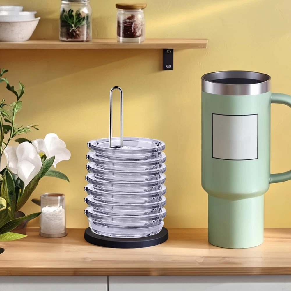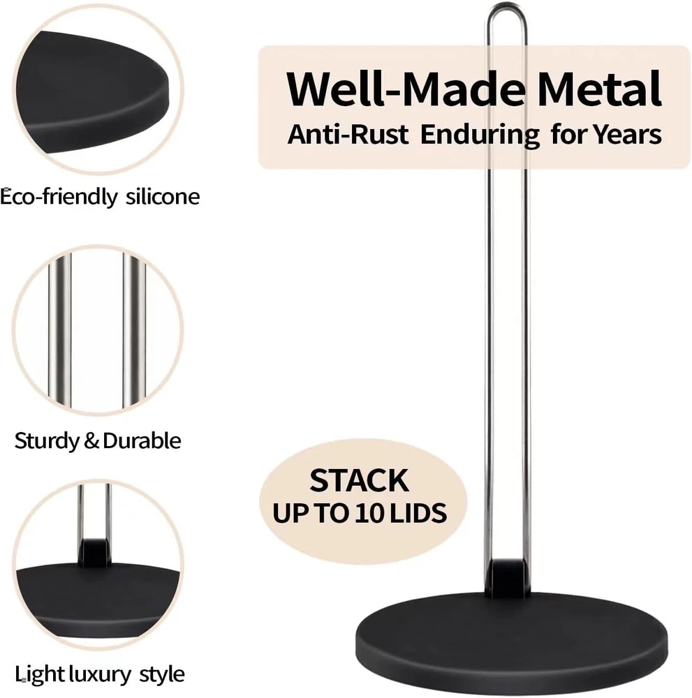 DOSTK 2PC Tumbler Lid Organizer, Tumbler Lid Holders for Kitchen Storage & Organization, Space - Saving Cup Lid Organizer for Yeti Tumbler & Stanley Tumbler & Simple Modern Tumbler Lids, Silicon Base Product Details Assembly Required: No Manufacturer: DOSTK Part Number: 2Pack White&Black Item Weight: 6.4 ounces Product Dimensions: 0.59 x 3.9 x 7.8 inches Country of Origin: China Item model number: 2Pack White&Black Batteries Included?: No Batteries Required?: No Material: Stainless Steel Brand: DOSTK Item dimensions L x W x H: 0.59 x 3.9 x 7.8 inches Shape: Rectangular prism Base Type: Pedestal Material: Made of silicone base + premium stainless steel, rustproof and waterproof to ensure long time use. No screws or manual fixing is needed. Stable Base: The tumbler Lid Holders has a weighted base, can help you one hand-operate easily, and the base is made of eco-friendly silicone to keep the lid holder in place when you place the lid. It also prevents the mental scratching of your countertop. Simple & Effective: Our tumbler lid organizer can help your cup lids from being scattered all over the place, No more rummaging through cluttered drawers or cabinets and find the tumbler lid replacement you need within seconds. Compatibility: This cup lid organizer can store up to 10 tumbler lids. It fits both of drinking lid and straw lid (NOTE: Straw Hole Over 0.59″). Perfectly compatible with Yeti lid, Stanley lid, Simple Modern lid, etc. Space Saving: Cup lid organizer features a foldable, stackable design that saves countertop space. It's a perfect solution for small kitchens, apartments, or any space where efficient use of space is paramount, You will love it!