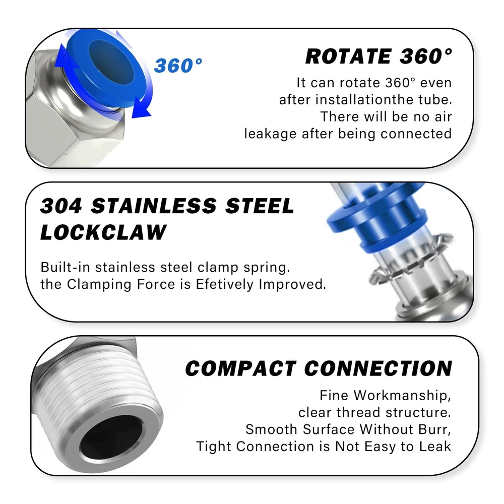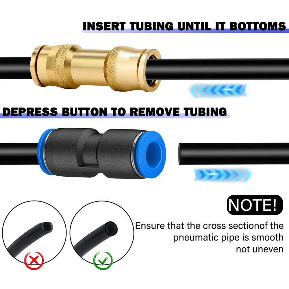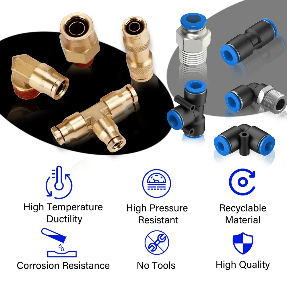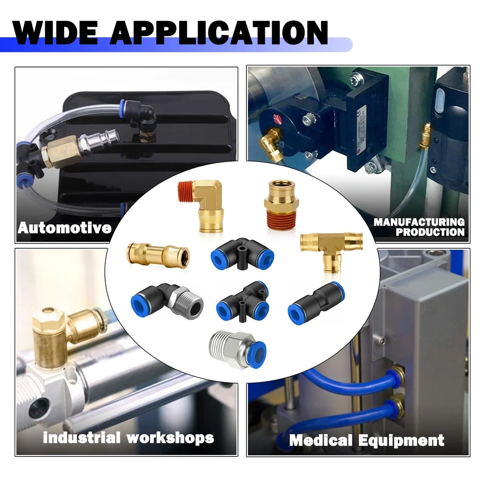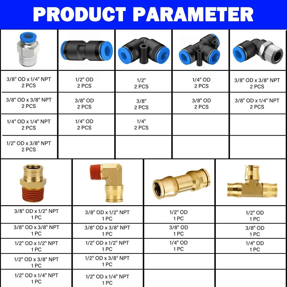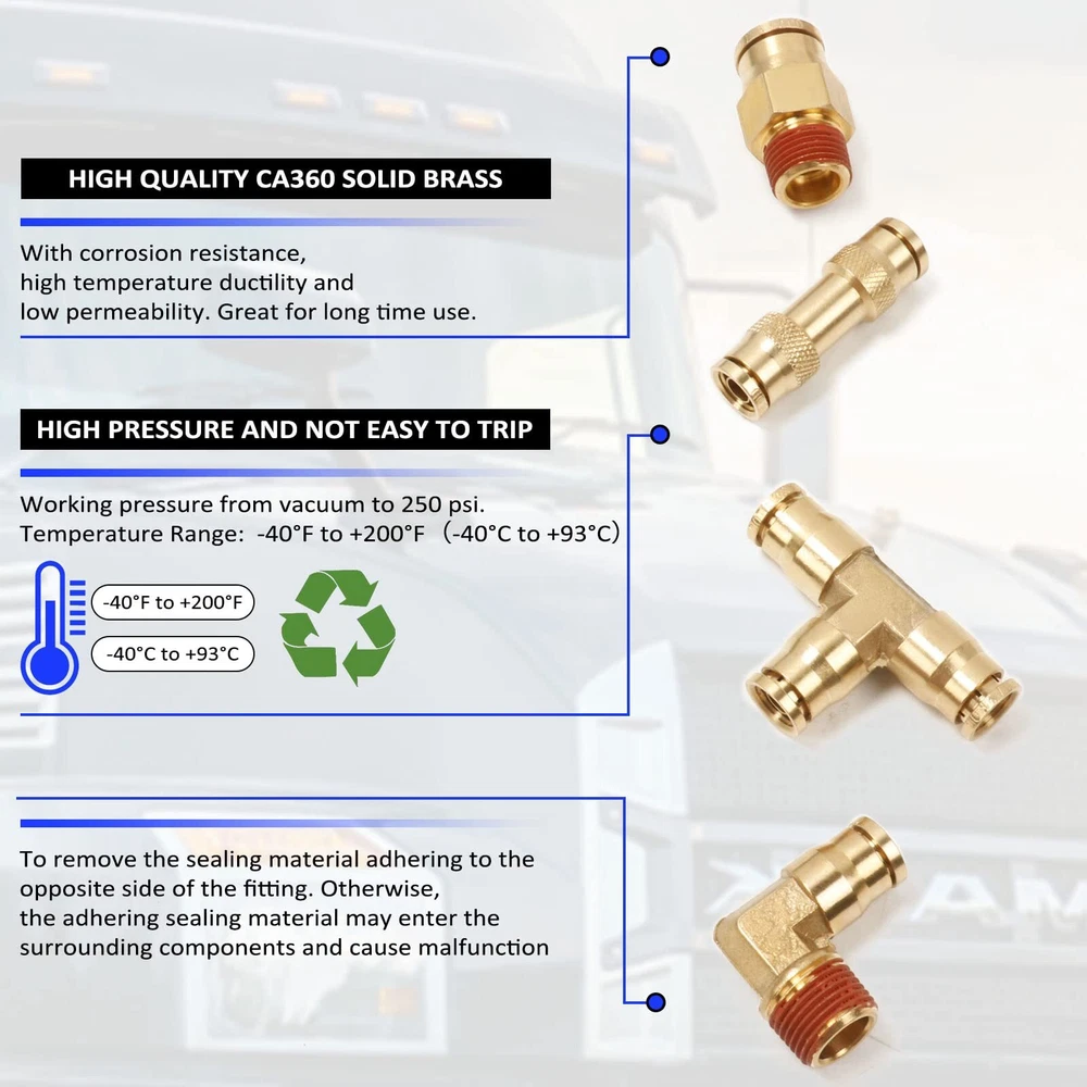 28PCS PNEUMATIC FITTINGS: Our quick connect air hose fittings kit is made of premium PBT plastic and copper with stainless steel lock claw and good steel washers for a thousand bounces. Good sealing performance and is not easy to leak. Kit contains: 8 pcs male straight push connectors, 6 pcs straight tube Unions, 6 pcs 90 degree Elbows, 4 pcs 90 degree Elbows NPT thread, 4 pcs tube Tees 16PCS DOT FITTINGS: Unique dot air fittings assortment is made of premium CA360 brass, meets D.O.T. FMVSS 571.106, SAE J1131,with corrosion resistance, high temperature ductility and low permeability. Kit contains: 5 pcs Male connectors. 5 pcs Male 90° elbows. 3 pcs Tube tees. 3 pcs Tube unions TYPICAL APPLICATION: The air brake line fittings are suitable for PU/PA/PE/PVC. The dot air line quick connect fittings can be used with air brake system, and copper tubing in air brake systems. They are widely applied in automotive, manufacturing production lines, car or truck repair, industrial workshops, daily garden or lawn mower repair, towing machine hose connections and so on EASY TO INSTALL: Our air fitting kit quicks disconnect simply push tubing in, no tools or loose parts to handle in tight places. Save your effort and time. And pieces that contain a threaded end already have sealant pre applied to provide good sealing performance and prevent to leak effectively MAX WORKING PARAMETER: PBT pneumatic fittings: Fluid type: air, vacuum, 0~145Psi, 0-0.9Mpa. Proof pressure: 1.32Mpa. High pressure resistance, long service life. Temperature Range: 0-60°C | 32-140°F. DOT air fittings: Working pressure from vacuum to 250 psi. Temperature Range: -40° F to +200° F(-40°C to +93°C)(Note: see tubing manufacturer’s recommendations for pressure and temperature mutations) AFTER SERVICE: Each product is assured to be in good condition before we ship it We can provide satisfactory customer service. What we desire is to bring you the best shopping experience