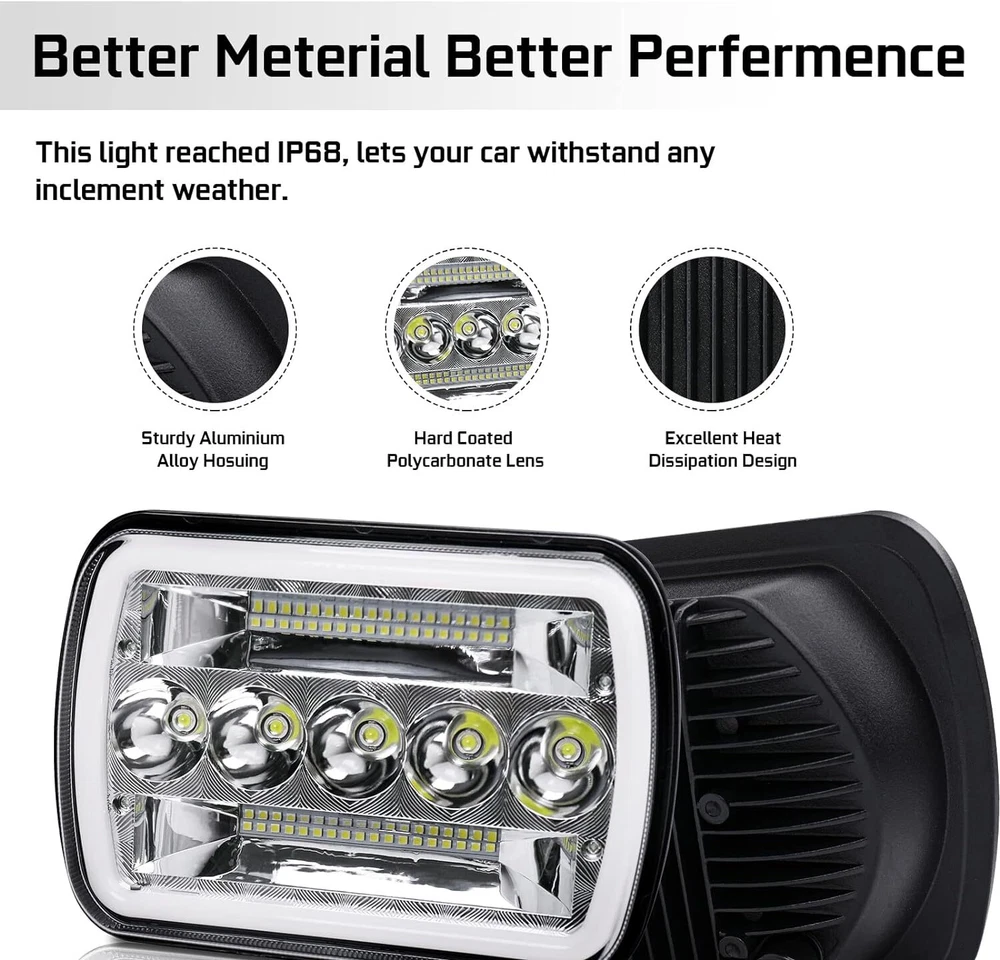 DOT NEW 7x6" LED Headlight DRL High/Low Beam 90W For Nissan Pickup 240SX D21 NX Features: 1. Hottest 7x6 5x7 inch led headlight. With Newest 120W Powerful LED chips, much brighter and durable than stock headlight or other headlights. 2. Three Light Mode: High Beam, Low Beam, DRL, 3. Super bright. 8250LM@high beam, 4250LM@low beam, 6000K-6500K Pure white light. Helps to reduce traffic accidents cause by bad weather or adverse road condition. Ensure driver\\\\'s safety. 4. Diecasting aluminum alloy shell is not easy to deform and will improve cooling performance. Surface electrostatic prevention, with EMC: Anti-electromagnetic interference. 5. Shock-proof and Waterproof IP67, Upgraded cooling system,More than 80,000 hours lifespan, Totally Risk-free under LIFETIME WARRANTY. 6. Easy to Install: Standard H4 socket, Just Plug and Play, connect the extend DRL wire with your car\\\\'s ACC. The anti-flicker is integrated with circuit board. Perfectly avoid flickering. 7. Certifications: CE, RoHS, ISO9002, DOT, SAE, IP67 Approved. 8. The cutoff is very shrill and straight, No Blind Area and dim spots. It won\\\\'t blind other drivers like other headlights. Specification: Type: Square Type Sealed Beam Lamp Size: 7x6\\\\'\\\\', 5x7\\\\'\\\\' Lighting Technology: LED Housing Color: Black Voltage: 10V-30V Light output: 8250LM high beam, 4500LM low beam LED Light Mode: High Beam/Low Beam/DRL/Turn Signal Light Power: High Beam(60W)/Low Beam(40W)/DRL(10W)/Turn Light(10W) Life span: Up to 70,000 hours Waterproof Rating: IP67 Material: Die-cast aluminum Lens Material: Clear PMMA Lens Itment Type: Direct Replacement Compatible with headlights: H6014 / H6052 / H6054 / 6054 Package Contents: 1x 7x6" 5x7" inch LED Headlight (Not including H4-H13 Adapter) Note: 1. Please confirm if the headlight fits your vehicle before purchasing. 2. Professional installation is strongly recommended in case of any difficulty in installation. 3. Please check whether the headlight is firmly installed before driving to ensure driving safety. 4. The picture may be a little different from that of real item due to the different display and different light. 5. If you have any questions about the product, please contact us. If you suffer from problems, such as dim headlights, malfunctioning headlights, or PINs on your vehicle are not standard, please purchase H4 9003 wiring harness. Our listing NOT INCLUDE. Fitment: Any other car H6054 H6014 H6054LL 69822 6052 6053 with 5"x7" OR 7"x6" Rectangular Headlight Fit For any Vehicle with 5x7 inches (also known as 7x6) Headlights,such as: For Jeep Models with 5"x7"(7"x6" ) Headlights. for Jeep Wrangler YJ 1987-1995 for Jeep Cherokee XJ 1984-2001 for Jeep Comanche MJ 1986-1992 Compatible with Headlights: H6014 / H6052 / H6054 / 6054 Some vehicles such as For Toyota may need to move the pins on the headlamp plug to different position.(or a adapter) For Dodge Models with 5"x7"(7"x6" ) Headlights. for Dodge Ramcharger 1988-1990 for Dodge Ram Pickup 1990-1993 for Dodge W250 1990-1993 for Dodge Van 1986-1993 for Chevy Silverado 1985-1987 for Dodge Ram 50, Omni, Colt, Caravan, Aries For Chevy Models with 5"x7"(7"x6" ) Headlights. for Chevrolet Astro for Chevrolet Tahoe, Tahoe S10 for Chevrolet S10, S10 Blazer, S10 Pickup( 1982-1994) for Chevrolet K1500, K2500 Suburban for Chevrolet Express 1500, 2500, 3500 for Chevrolet C1500 Suburban, C2500 Suburban for Corvette, Colorado For GMC Models with 5"x7"(7"x6" ) Headlights for GMC Savana 3500 ( 1998-2002, 2004, 2007, 2009-2012) for GMC Savana 2500 ( 1998-2001, 2004, 2006, 2008, 2010-2012 ) for GMC Savana 1500 ( 1998-2001, 2003, 2005, 2007, 2009-2012 ) for GMC Safari ( 1998-2002, 2004, 2005 ) for GMC K3500 ( 1997-2000 ) for GMC K2500 Suburban ( 1997-1999 ) for GMC K2500 ( 1997-2000 ) for GMC K1500 Suburban ( 1997-1999 ) for GMC K1500 ( 1997-1999 ) for GMC C2500 Suburban ( 1997-1999 ) for GMC C2500 ( 1997-2000 ) for GMC C1500 Suburban ( 1997-1999 ) for GMC C1500 ( 1997-1999 ) For Ford Models with 5"x7"(7"x6" ) Headlight for Ford F-150 for Ford F-250, F-250 Super Duty for Ford F-350 Super Duty for Ford F-450 Super Duty for Ford F-550 Super Duty for Ford E-150, E-150 Econoline, E-150 Econoline Club Wagon for Ford E-250 for Ford E-350 Super Duty, E-350 Econoline Club Wagon, E-350 Econoline, E-350 Club Wagon for Ford E-450 Super Duty For Mazda Models with 5"x7"(7"x6" ) Headlights for Mazda B2000 B2200 B2600 RX-7 GLC For Nissan Models with 5"x7"(7"x6" ) Headlights for Nissan Hardbody D21 Pickup (1986-1994 ) for Nissan Pickup (1995 1996 1997 ) for Nissan NX (1991 1992 1993 ) for Nissan 200SX (1985 1986 1987 1988 ) for Nissan 240SX (1989-1994 ) for Nissan 300ZX (1984 1985 1986 ) for Nissan Sentra (1982 1983 1984 ) For Toyota Pickup,for Toyota MR2,for Toyota Celica,for Toyota Supra
