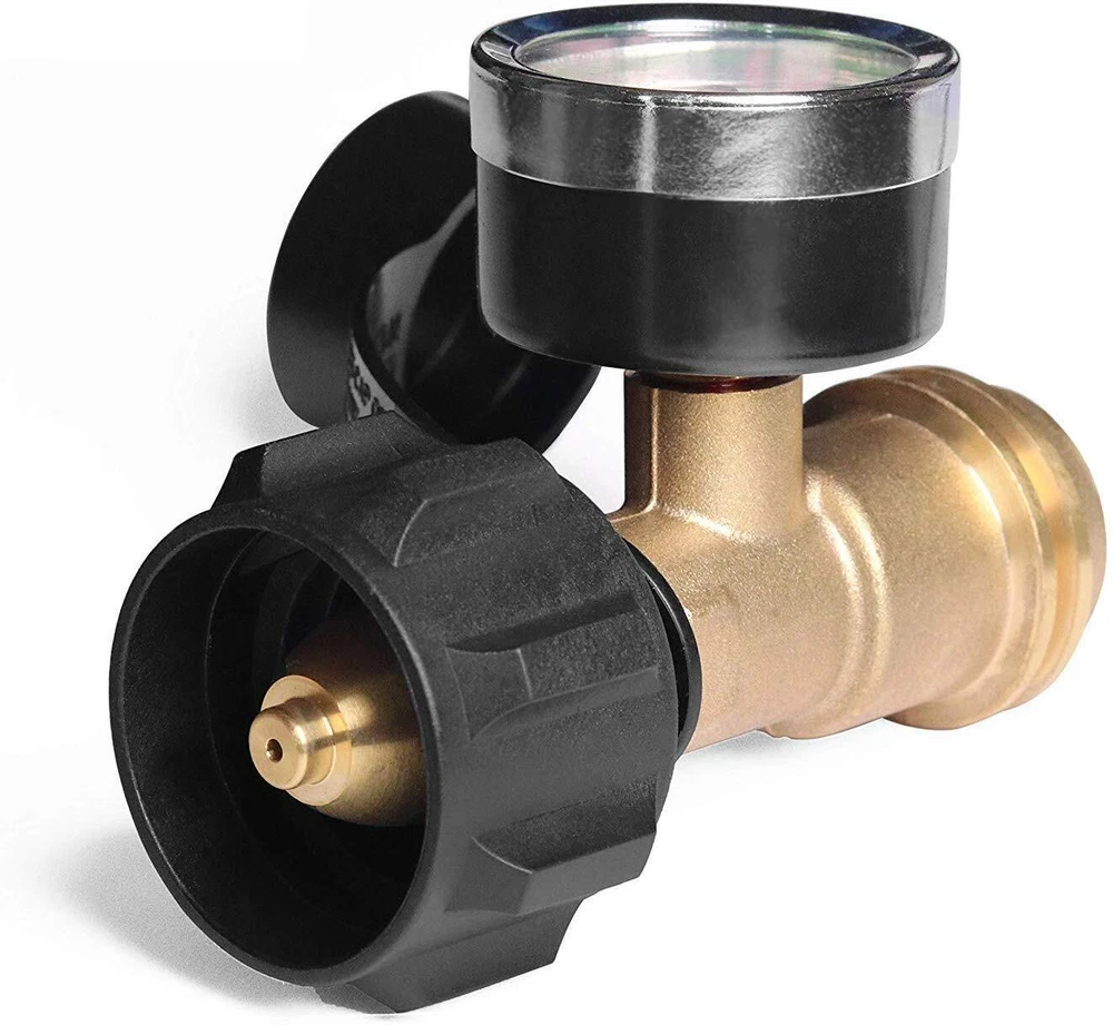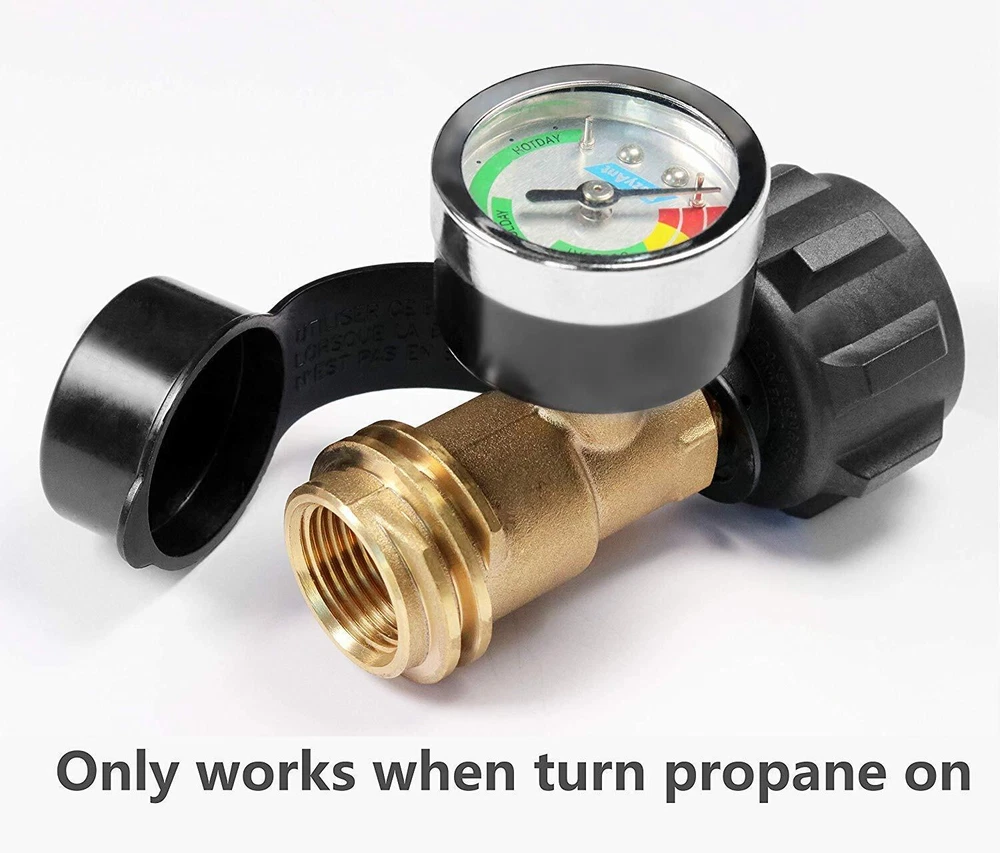 Compatible with all appliances with a QCC1 / type1 connection and up to 40-lb. propane tanks. Heavy duty 100% solid brass construction withstands weather, scratching, denting and corroding. Monitors fuel level without removing the tank. Gauge display accounts for ambient temperature change. Color coded dial for allowing you to see at a glance when your propane level is low. This propane tank gas gauge can be worked with propane tank cylinders, propane regulator with hose and propane adapter Coming with dust cover. No tools required and easy to install with handheel grip for tightening. Great for using gas grill, heater, smoker, camp stove, lantern, tabletop grill, fire pit table, turkey fryer and more propane appliances.