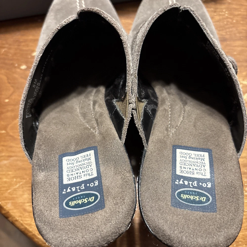 These are Dr. Scholl's Burner clogs in a size 8M, designed with gray suede leather, a slip-on style, and a comfortable wedge heel. They feature textured heels, a strap with a round buckle decor, and are cushioned with memory foam for added comfort. These clogs have a Bohemian and American theme, making them a stylish and cozy choice for casual occasions. With box. Lightly worn once. EUC Like New. International charges are the buyer’s responsibility. No international returns.