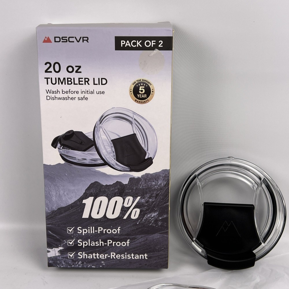 This is a brand new pack of 2 generic replacement DSCVR 20 oz Tumbler Lids, with features and compatibility details. Very durable!!!! Product: DSCVR 20 oz Tumbler Lid, sold in a pack of two. Features: The lids are advertised as 100% Spill-Proof, Splash-Proof, and Shatter-Resistant, and come with a 5-year warranty. Care Instructions: They are dishwasher safe and should be washed before initial use. Compatibility: These lids are designed to be compatible with various 20 oz tumblers and mugs that have an inside diameter of approximately 3.20 inches, including models like the 20 oz Yeti Rambler, 20 oz Ozark Trails, and 10 oz Yeti Mug. It's important to note they are not compatible with the new style of RTIC tumblers.