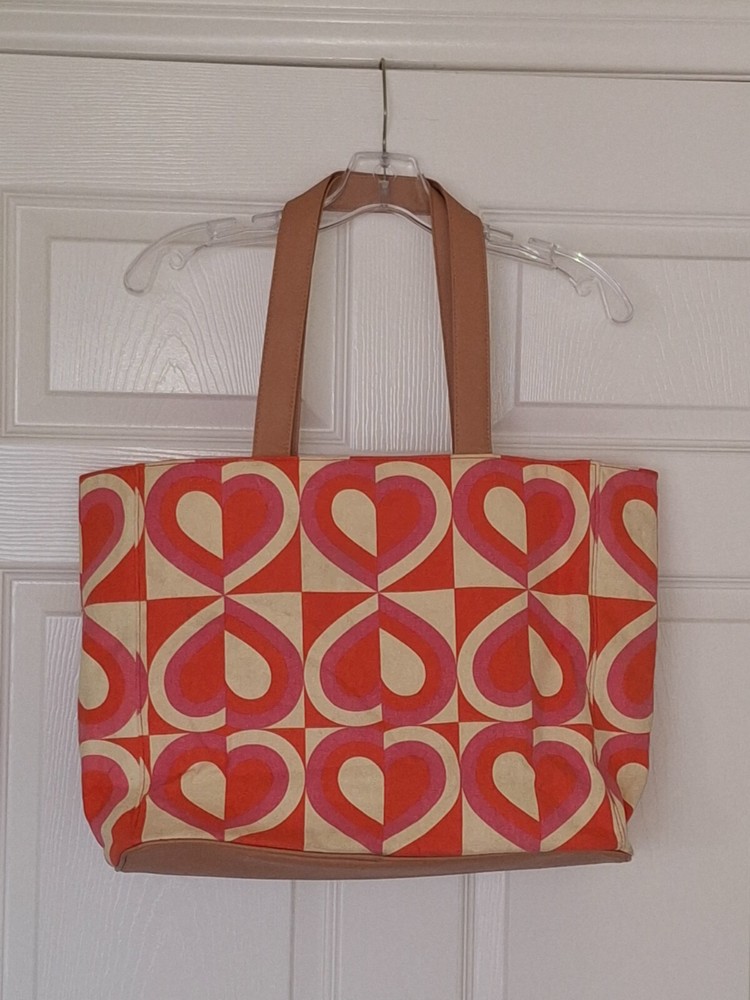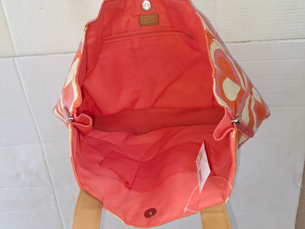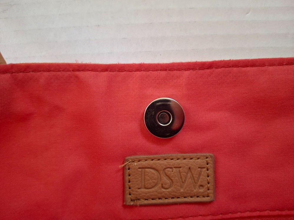 DSW Tote with Faux Leather Straps and Magnetic Snap Closure. This is a bag that still has the/Tags and has never been used but has a couple of small Scuffs from Storage. Very Good Pre-Owned Condition.
