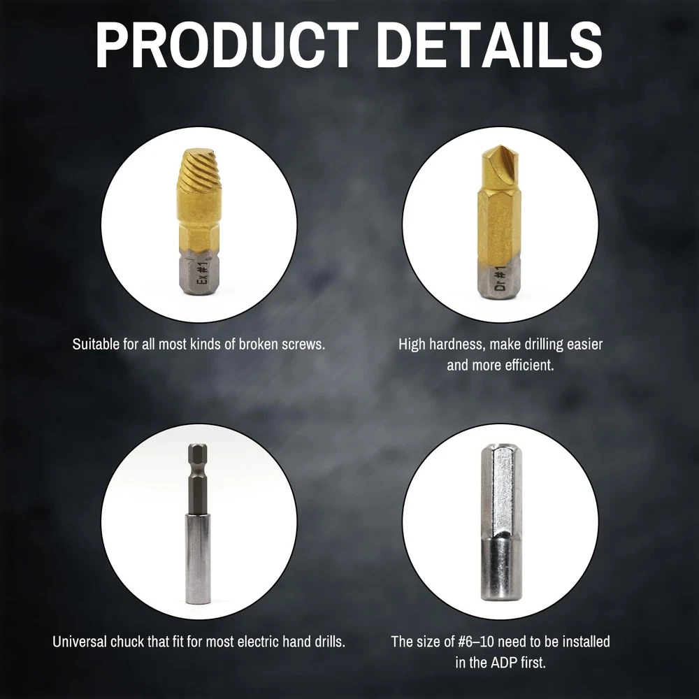 DTRUCTIEW 22PCS Titanium Damaged Screw Extractor Set, HSS 4341 Stripped Screw Extractor Kit, Easy Out Stripped Screw Extractor of Rusty & Broken with Magnetic Extension Bit Holder & Socket Adapter Superior Material: Our damaged screw extractor kit is made of high-quality high-speed Steel 4341 and Titanium. It features High hardness, is durable, and is tough enough to easily remove damaged screws and make your work more efficient. With the different size, which allows you to carry it in a pocket or with their drill. High Performance: 22Pcs easy-out screw extractor set, including 10 drills (DR), 10 extractors (EX), 1 adapter (ADP), and 1 extension bit holder, making it a conveniently comprehensive kit. Can be removed in one step, you do not need to convert the extractor or adjust the chuck. 0.05 to 0.22 inch extractors are suitable for extracting stripped, broken, or damaged screws with 0.06-0.36 inch bolts. Easy to Use:First, choose the drill bit that is smaller than the damaged screw, install the bit on the electric hand drill, and drill down to create a clean hole. Then, change to an extractor (usually the same size as the drill) that is suitable for the hole, screw in a counterclockwise rotation, and take it out. Note: The Drills (Dr#6–10) and Extractors (Ex#6–10) need a socket adapter with the extension bit holder to function. Applicable Screws: This damaged screw extractor set has 10 different sizes to satisfy all your demands. Fits various soft screws and bolts, such as tiny electronics screws, hexagon socket bolts, square head screws, wood screws, hexagon head screws, mechanical screws, sheet metal screws, lag bolts, hex bolts, etc. (Note: The screw extractor is made of high-speed steel 4341 and titanium. It is suitable for most standard screws, especially performing exceptionally well with aluminum alloy and mild steel screws. However, its effectiveness may vary when dealing with stainless steel screws) Portable to Carry: The stripped screw extractor is packaged in a storage box with foam pad to ensure that you will not lose one. The compact size allows you to carry with and use it for home DIY or garden woodwork, small household appliances, or electronics assembly. It is designed to work with the electric hand drills, can not be used in the hammer drill mode! Must be low speed during use! Superior Material: Our damaged screw extractor kit is made of high-quality high-speed Steel 4341 and Titanium. It features High hardness, is durable, and is tough enough to easily remove damaged screws and make your work more efficient. With the different size, which allows you to carry it in a pocket or with their drill. High Performance: 22Pcs easy-out screw extractor set, including 10 drills (DR), 10 extractors (EX), 1 adapter (ADP), and 1 extension bit holder, making it a conveniently comprehensive kit. Can be removed in one step, you do not need to convert the extractor or adjust the chuck. 0.05 to 0.22 inch extractors are suitable for extracting stripped, broken, or damaged screws with 0.06-0.36 inch bolts. Easy to Use:First, choose the drill bit that is smaller than the damaged screw, install the bit on the electric hand drill, and drill down to create a clean hole. Then, change to an extractor (usually the same size as the drill) that is suitable for the hole, screw in a counterclockwise rotation, and take it out. Note: The Drills (Dr#6–10) and Extractors (Ex#6–10) need a socket adapter with the extension bit holder to function. Applicable Screws: This damaged screw extractor set has 10 different sizes to satisfy all your demands. Fits various soft screws and bolts, such as tiny electronics screws, hexagon socket bolts, square head screws, wood screws, hexagon head screws, mechanical screws, sheet metal screws, lag bolts, hex bolts, etc. (Note: The screw extractor is made of high-speed steel 4341 and titanium. It is suitable for most standard screws, especially performing exceptionally well with aluminum alloy and mild steel screws. However, its effectiveness may vary when dealing with stainless steel screws) Portable to Carry: The stripped screw extractor is packaged in a storage box with foam pad to ensure that you will not lose one. The compact size allows you to carry with and use it for home DIY or garden woodwork, small household appliances, or electronics assembly. It is designed to work with the electric hand drills, can not be used in the hammer drill mode! Must be low speed during use! Shipping from the USA All of our products are shipped from the USA, ensuring quick delivery to your destination. Payment We offer the following payment methods: PayPal, credit card, bank transfer, and eBay's secure payment system. Free Shipping & Free Returns Shipping within the USA is FREE. Additionally, any return is absolutely free for you. Risk-Free Purchase You have the option to return an item within 30 days without any justification. We cover the return shipping costs! Fast Shipping We ship immediately upon receipt of payment. Generally, the package is delivered within 2-3 days in the USA. If it takes longer, we will contact you. Quality and Costs Made in Europe, USA, China No customs fees or additional charges Total satisfaction guarantee Invoice with declared VAT available upon request in .pdf format Feedback Your feedback is very important to us. After you pay for your purchase, you will automatically receive positive feedback from us.