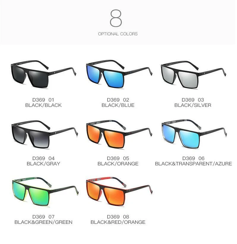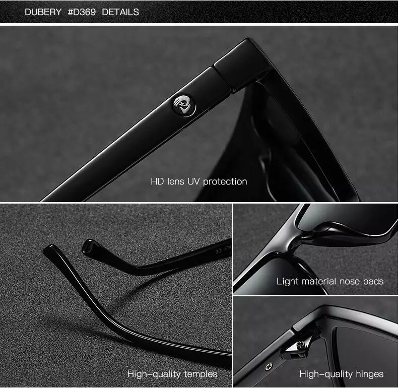 DUBERY Men Women Polarized Sport Sunglasses Square Driving Fishing Glasses UV400 Description Brand:DUBERY Frame Material : Plastic Lens Material:Polycarbonate Visible Perspective Rate: 99% Anti-UV rating: UV400 Whether polarized : Yes. Gender:Men/Women Lens width: about 61 mm Lens height: about 49 mm Bridge: about 16 mm Frame Width: about 139 mm Temple Length : about 138 mm Package included: 1*Sunglasses(Not include boxes and other accessories) Note: 1. Due to the different monitor and light effect, the actual color of the item might be slightly different from the color showed on the pictures. Thank you! 2. Please allow 1-3mm measuring deviation due to manual measurement. Brand DUBERY MPN Does Not Apply Style Square Lens Technology Polarized Frame Material Plastic Temple Length 138 mm Country/Region of Manufacture China Theme Classic, Designer, Logo, Outdoor, Sports Frame Width 139 mm Model D369 Frame Color Multicolor Department Men Lens Material Mirror, Polycarbonate UV Protection UV400 Bridge Width 16 mm Features Reflective Lens Height 49 mm Lens Width 61 mm Personalized No Type Sunglasses