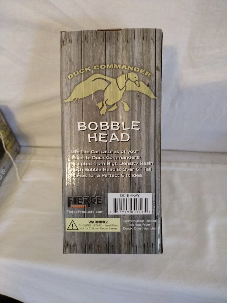 This duck dynasty bobble head features Kay Robertson and is a must-have for any fan of the popular TV show. The item measures 8 inches in length and comes in its original box, making it a great addition to any collection. Whether you're a hunter or just a fan of the show, this bobble head is sure to be a conversation starter. The duck dynasty bobble head is perfect for those who love to collect unique items or for those who want to show off their love for the popular TV show. Its intricate details and high-quality design make it a great piece to display in any room. Get yours today and add a touch of fun to your collection!