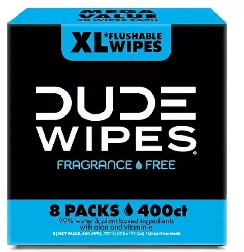 FREE SHIPPING DUDE WIPES XL Flushable Wipes, Fragrance Free, 8 ct., 400 wipes Dude Wipes Flushable Wipes elevate the ordinary into a clean, invigorating experience. In easy pop-up dispensers, these flushable wipes are 35% larger than the average flushable wet wipe to get the job done more efficiently. Dude Wipes are gentle on your skin and will leave you feeling refreshed and ready for whatever the day brings. Plus, they're eco friendly–free from fragrances, dyes and parabens. Made with 100% water and plant-based ingredients, including Aloe Vera, and Vitamin E, our wet wipes are gentle on your skin and formulated for a more refreshing feeling than toilet paper. Dude Products flushable wipes are made with plastic-free and plant-sourced fibers to help protect both the planet and your pipes. Unlike baby wipes, Dude Wipes begin to break down once flushed, making them sewer-safe and septic-safe. Plus, our plush wet wipes come in sleek dispenser packs that fit perfectly in the bathroom. Unscented, with naturally soothing aloe vera and vitamin E to protect your sensitive sides 8 packs of 50 wipes each for a total 400 Extra Large DUDE Wipes Eco friendly: Wipes are composed of 100% plant-based fibers 7" x 7" (17.8cm x 17.8cm) Shipping Info Standard Warranty This product is covered by the Sam's Club Member Satisfaction Guarantee. Component country USA Assembled country USA