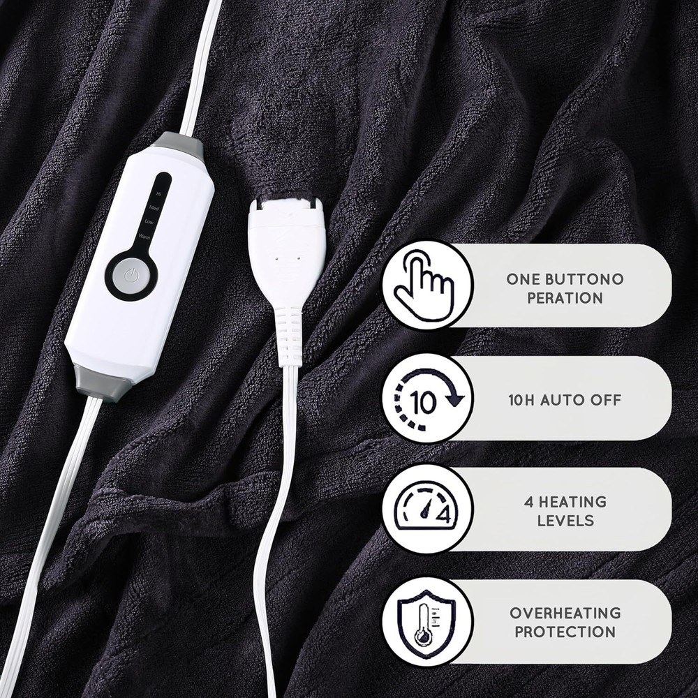 This heated blanket is incredibly cozy and keeps me warm all night! The coral fleece feels soft against my skin, and the four heat settings let me adjust the warmth just right. It heats up quickly, and the auto-off feature gives me peace of mind. The size is perfect for my bed, and the dark grey color looks sleek. Lightweight yet durable, it’s become my go-to for chilly nights—totally worth it!
