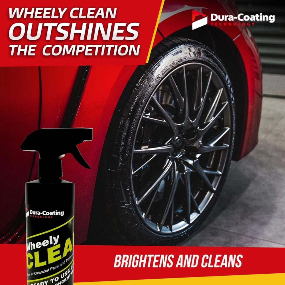 ULTIMATE CLEANER: Say goodbye to stubborn brake dust and road grime! Wheely Clean is a ready-to-use formula that effortlessly restores your wheels to their original luster, ensuring a showroom sparkle. Don’t let brake dust dull your shine; our ultimate cleaner is here to bring back that pristine look. GLOSS POWER: Transform your wheels with exceptional gloss enhancement! Our high-performance cleaner not only removes tough stains but also rejuvenates heavily soiled rims. Experience the brilliance of your wheels as they dazzle with a clean, glossy finish that’s hard to miss. VERSATILE USE: Wheely Clean isn't just for wheels—it's a versatile addition to your car care kit. Safe for use on glass, non painted, and clear coat surfaces, it’s perfect for chrome and aluminum wheels. This all-in-one solution caters to all your automotive detailing needs, making your vehicle shine from every angle. EASY SCRUB: Enjoy the convenience of fast and easy wheel cleaning! Simply spray on Wheely Clean, let it soak for 1-2 minutes, scrub thoroughly with a wheel brush, rinse with water, and watch as it works its magic while air drying. This efficient and highly effective formula makes wheel maintenance a breeze. MADE IN THE USA: Proudly crafted in Naples, Florida, by Dura-Coating, our products reflect our American heritage. Our professional grade car detailing solutions deliver reliable results. As a small family business, we are committed to providing quality products that we use in our own car detailing shop, making sure you get products you can trust.