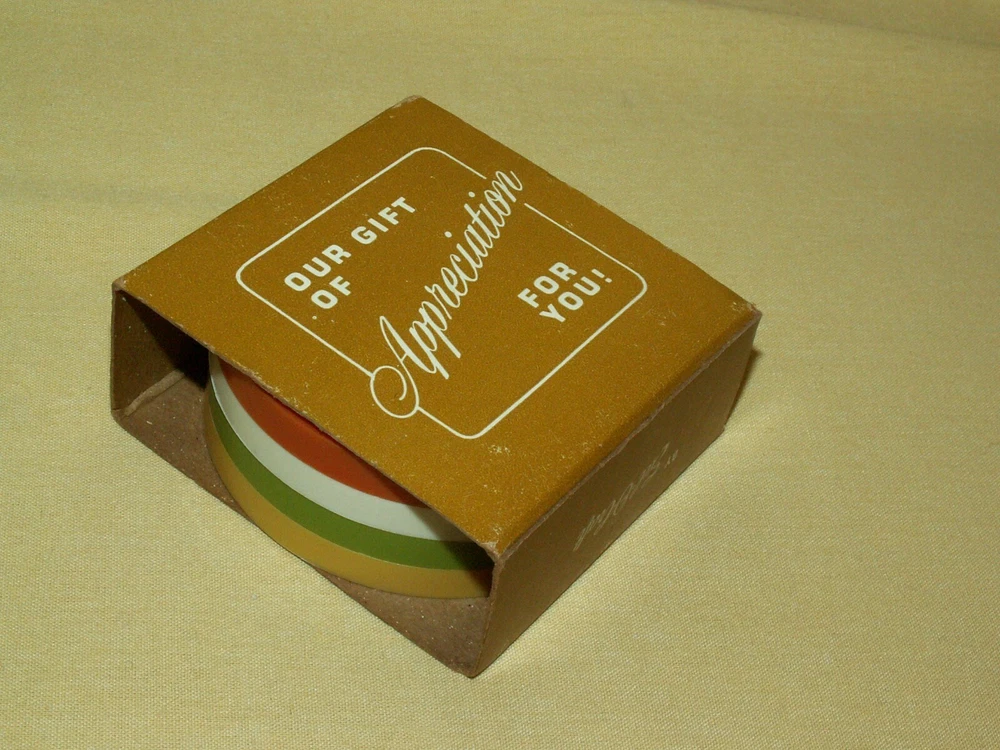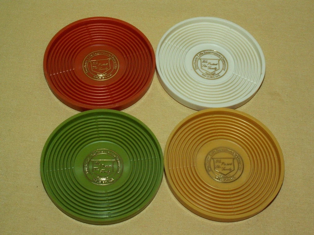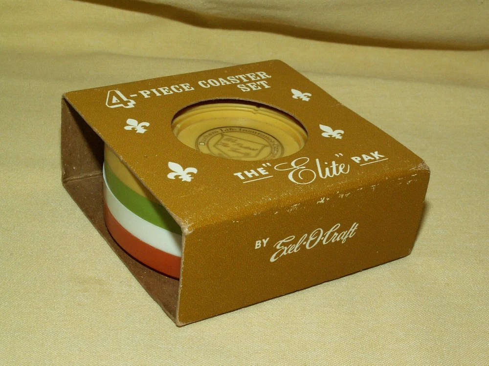 **You are bidding on a great vintage Plastic 4 Color (White Yellow Orange Green) 4 Piece Boxed Coaster Set “The Elite Pak” by Exel-O-Craft – “Our Gift Of Appreciation For You!” – featuring Durham Life Insurance Company Raleigh NC North Carolina “We Protect The Family” – each coaster has Gold Lettering and is marked Foley on the back - package measures 3 by 3 by 1 ¼ inches – packaging shows minor rubbing from storage, coasters are in very good and clean condition. I actually have two sets of these – if you are interested in more than one set, please let me know and I will alter the listing and combine shipping. {18537.148201} I am by no means an expert, so please feel free to ask plenty of questions. I will ship USPS - either Priority or Standard Post depending on the size and weight of the item. Please note that if you are bidding from outside of the United States, the shipping will be more expensive. Please contact me regarding a quote on shipping or refer to the Shipping Calculator for shipping charges. In all instances, please wait for an invoice before paying so that I can give you the correct amount for shipping and handling. I only accept PayPal due to EBay’s requirements. I am always happy to provide additional pictures or answer additional questions. Please note that I will reply during the evening hours since I am may be unavailable to my computer during the daytime hours. Your purchase comes from a clean, smoke free, pet free home. I try to describe the overall condition as best possible. Please ask questions BEFORE bidding. Your purchase is FINAL and NO REFUNDS will be given. Also, please note that you are buying this item AS IS – be aware of any toy recalls if necessary and know that you are purchasing a collectible for an adult versus a toy for a child. I do not add insurance automatically – if you would like to insure your item, please let me know. Please contact me within 48 hours of receiving your invoice so that we can make payment/delivery arrangements. Note that payment is due within a week of receiving your invoice; if not, I will