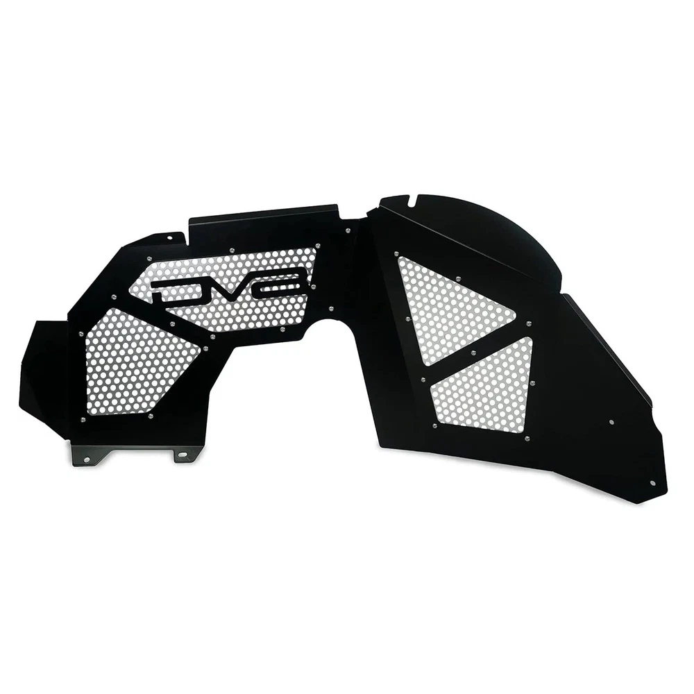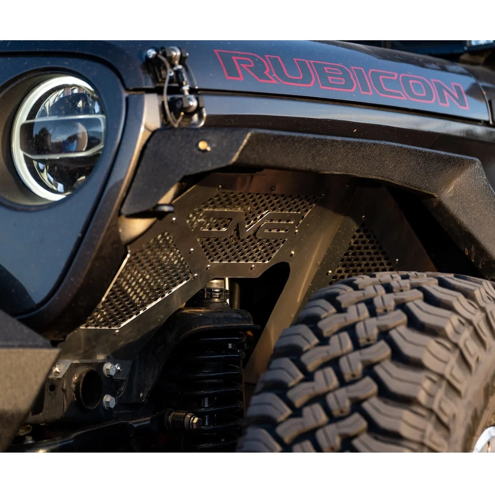 $ImageURL1$ DV8 Offroad Front Inner Black Fenders for Wrangler JL Gladiator JT INFEND-03FB PART NUMBER: INFEND-03FB BRAND: DV8 Offroad DESCRIPTION DV8 Offroad Front Inner Fenders DV8 Off Road Aluminum Jeep Wrangler JL & Gladiator Inner Fenders are designed to reseal your engine compartment when using aftermarket or stock fenders, clean up the look of your inner fender, and provide better air flow where it counts. Their inner fenders also allow easy access to the shocks and do not require for the fender and inner fender to be removed like their competitors! DV8 Inner fenders are available in raw aluminum or powder coated black. Key Features: Lightweight aluminum Mesh panels to improve airflow Paintable aluminum mesh panels Protects the engine compartment Simple installation Specifications: Fitment: Direct Fit, Bolt-On Finish: Black Powder Coat OR Raw Aluminum, the choice is yours! Material: Aluminum