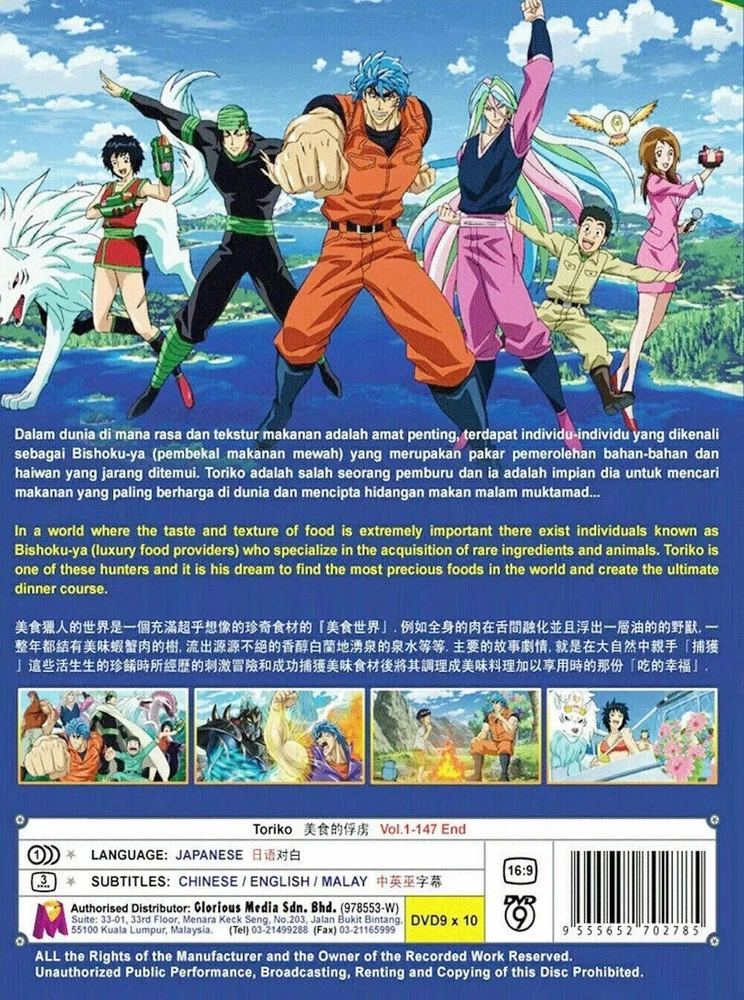 TITLE : TORIKO DESCRIPTION No of Disc : 10 No of Episode : 1 - 147 End Language : Japanese Subtitle : English / Chinese Format : DVD / NTSC & All Region Code (16.9) Shipping Time Tracking Number Provided To Track Your Shipment Delivery 10 to 18 Days Without Sat & Sun Working Days Payment Paypal Accepted Contact US Any Problems Or Enquiries Please E-Mail US Thanks Feedback Should Any Problem Arise, Please E-Mail To Let US Know & We Will Do Our Best To Rectify Any Problems Return Within 14 Days No Questions, Ask Return. Buyer Will Need Pay Return Postage WE SELLING ALL ORIGINAL PRODUCT AND SIRIM MALAYSIA APPROVE BY GOV DEPARTMENT Thanks For Shopping Have a Nice Days