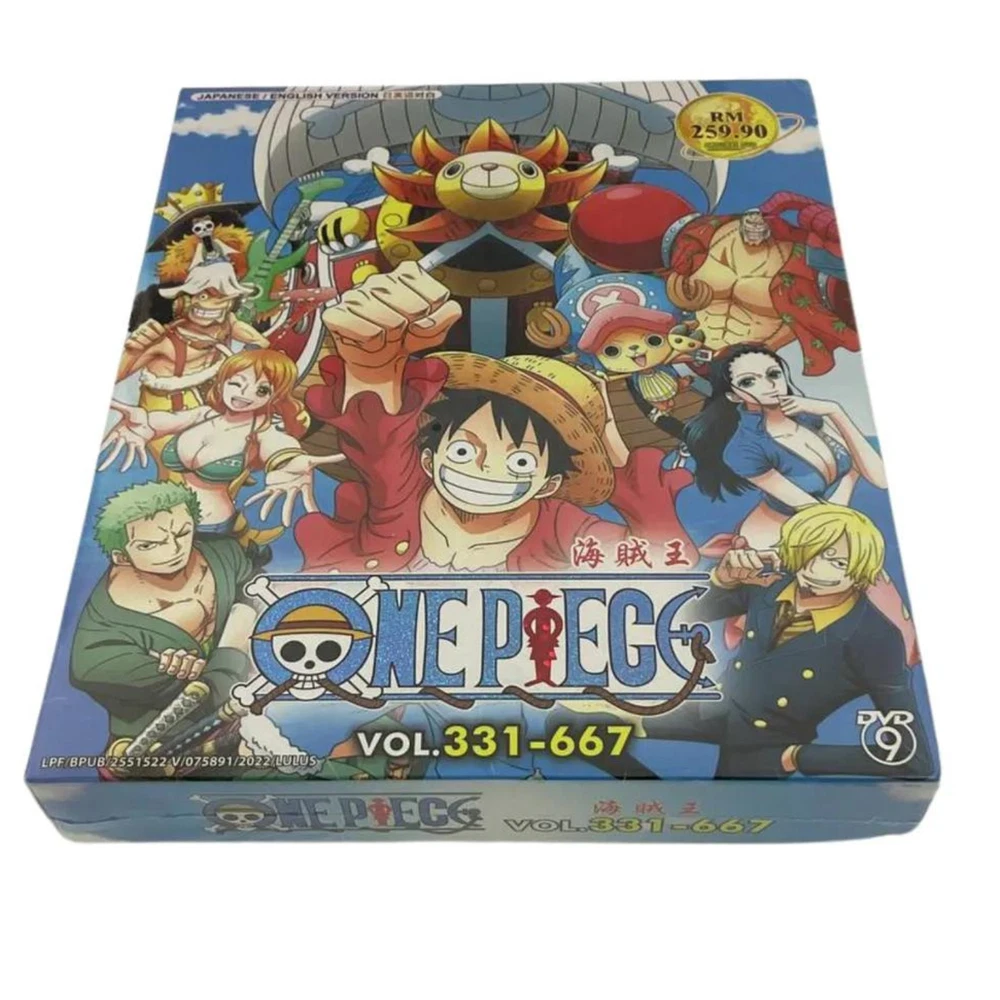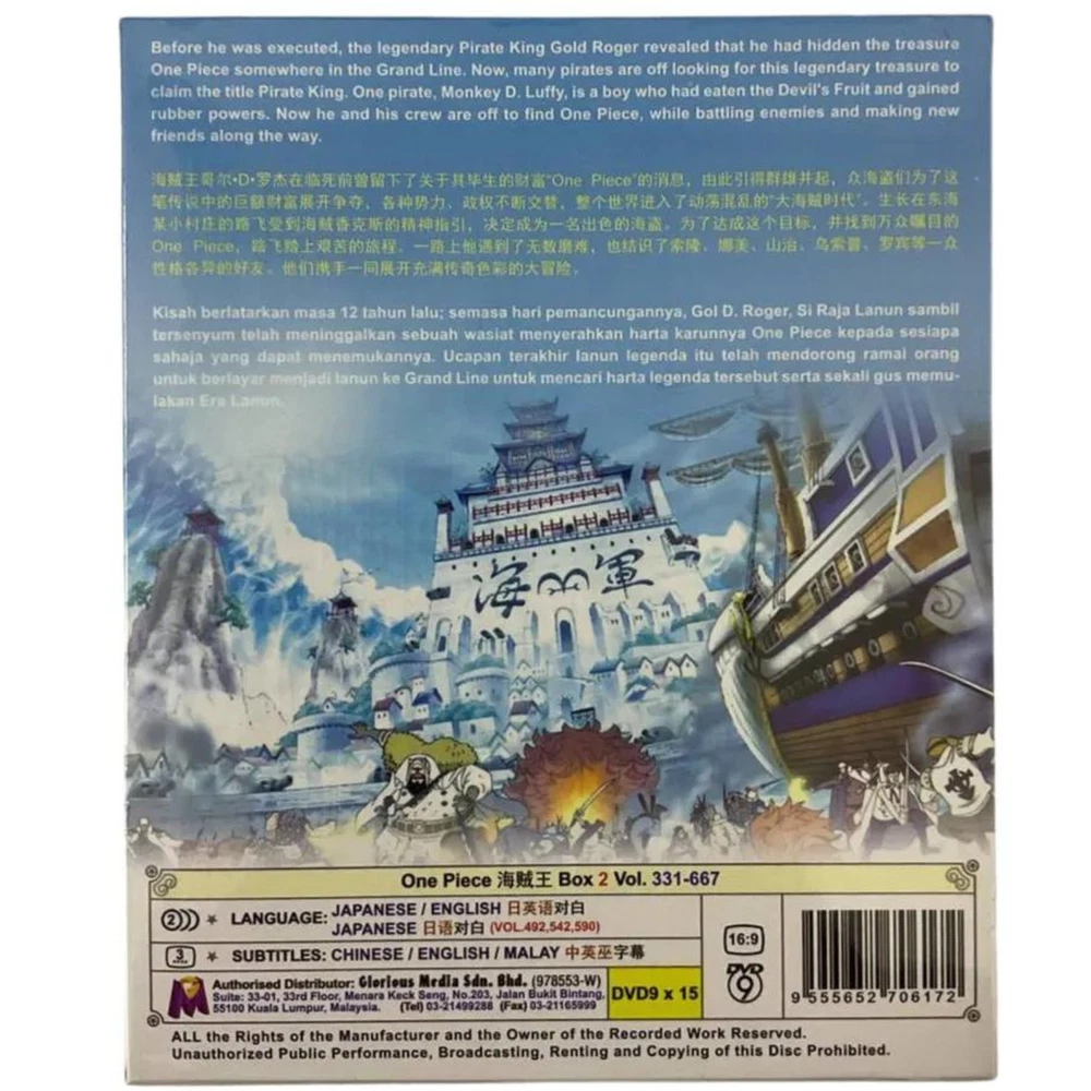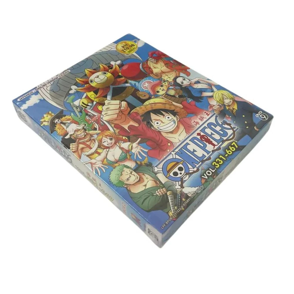 Movie/TV Title: One Piece Release Year: 1999 Features: Dubbed, With Subtitles Sub-Genre: Action, Adventure Language: English, Japanese Format: DVD Edition: Box Set Region Code: DVD: 0/All (Region Free/Worldwide) Music Artist: n/a gtin13: Does not apply Rating: PG Case Type: Tall/DVD Case Type: TV Series Director: n/a Studio: Toei Animation Aspect Ratio: 16:9 Subtitle Language: Chinese, English, Malay Genre: Animation & Anime Season: Complete Series Box Set Video Format: NTSC UPC: Does not apply Actor: n/a Franchise: One Piece Cinematic Movement: n/a Country/Region of Manufacture: Malaysia