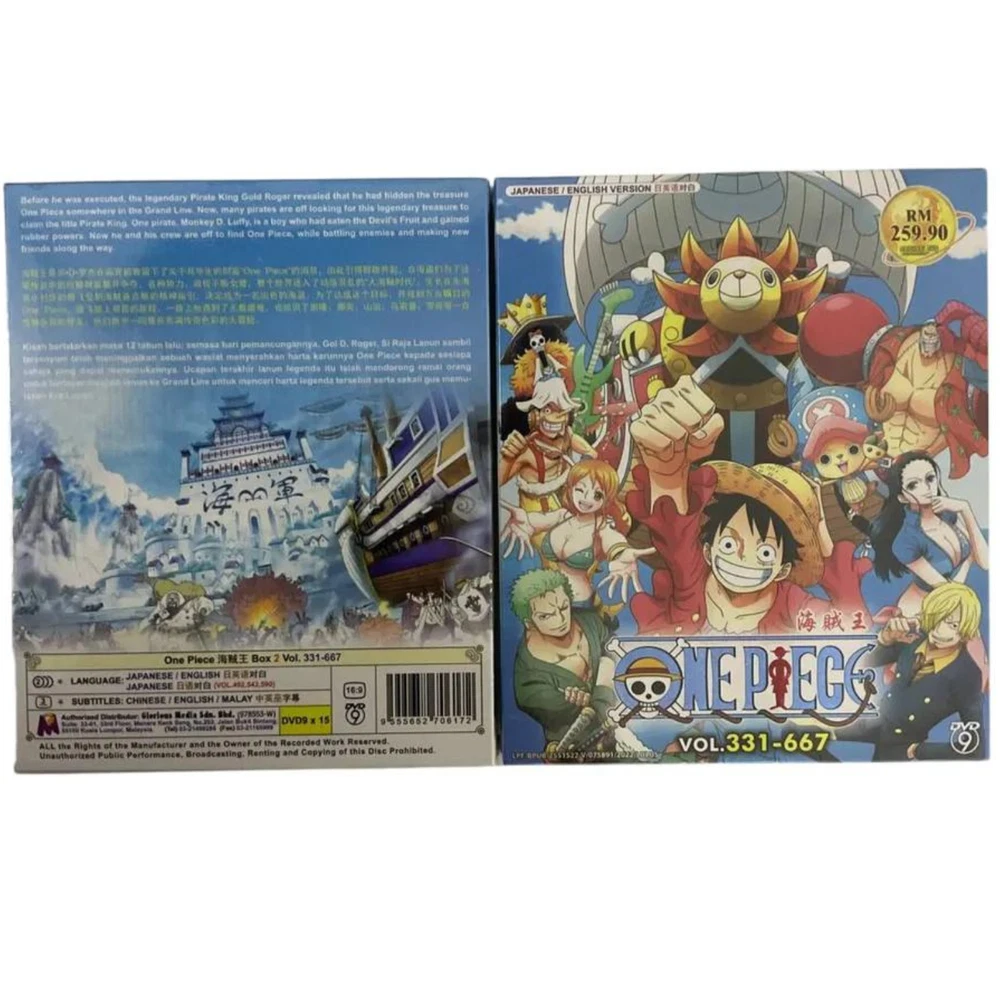 DVD Anime One Piece Box.2 TV Series (Vol.331-667) ~ English Dubbed All Region Synopsis: Before he was executed, the legendary Pirate King Gold Roger revealed that he had hidden the treasure One Piece somewhere in the Grand Line. Now, many pirates are off looking for this legendary treasure to claim the title Pirate King. One pirate, Monkey D. Luffy, is a boy who had eaten the Devil's Fruit and gained rubber powers. Now he and his crew are off to find One Piece, while battling enemies and making new friends along the way. Features and further details Title : One Piece Box 2 Vol. 331 - 667 (English Dubbed) Details: No Of Disc : 15 Disc Language : Japanese / English (Attn - Episode 492 - 542 - 590 : Japanese) Subtitle : Chinese / English Format : DVD / NTSC & All Region Code (16.9) Genres: Action, Adventure, Fantasy Weight : 441g Contact us We can be contacted at any time through eBay messages if you have any questions, comments or product requests. We will respond to you within 24 hours and do our best to help you out! We encourage our customers to contact us with any questions or concerns! We'd like to be sure you are completely satisfied with your purchase. Payment We accept payment via eBay - managed payment Shipping We are using standard international shipping. Handling time is 1-3 business working days. Your goods will be shipped with valid tracking number. All products is packed , layered with bubble wrap to reduce damages during shipment delivery. Estimated delivery is between 11 to 23 business working days. We also provide express shipping as an option. Estimated delivery is between 5 to 8 business days. **Rest assured we will ensure your package arrives as soon as possible. However, the delivery may be delayed due to some unforeseen circumstances which is out of our control, such as bad weather, high postal traffic and the performance of shipping companies. Return If you have any problem with the order, do contact us via eBay message, we will be glad to assist you and resolve your problems as soon as possible. Items can be returned within 30 days in good condition. Note: Import duties, taxes and additional charges are not included in item price or shipping charges. Please be aware these custom import duties and taxes are buyer's responsibility. Free eBay listing template designed by © dewiso.com .