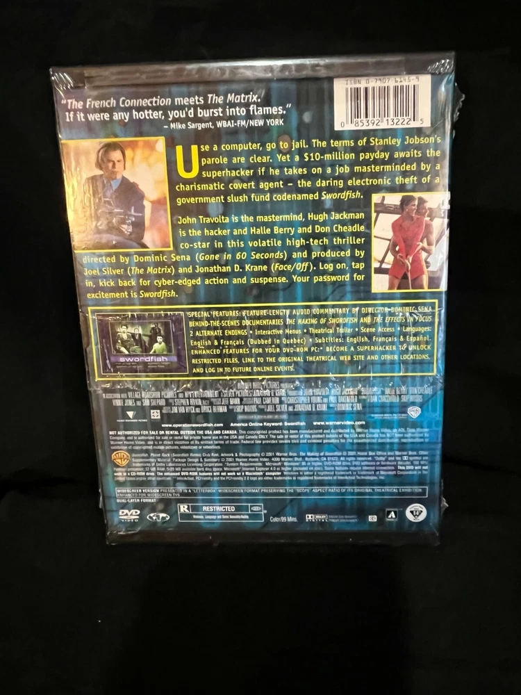 NEW DVD FACTORY SEALED. "Swordfish" starring John Travolta, Hugh Jackman, Halle Berry, and Don Cheadle. DESCRIPTIONS I try to describe my items as accurately as possible. If I have overlooked a problem don't hesitate to contact me about it. Pictures are part of the description also. Manufacturing defects are not considered damage, but I will bring them to your attention when it creates a problem with the item. PAYMENTS Payments will be expected within 7 days of sold date. If payment has not been received within that time frame an unpaid item report will automatically be filed. If you have a problem, please contact me before the deadline. I am easy to work with. COMBINING SHIPPING **PLEASE READ If you purchase more than one item, please add them to your shopping cart and then request an invoice from the seller. Do not pay before asking for a correct invoice. If possible, I will combine the shipping charges, but if the weight goes over I have to charge accordingly. Most times you will save money. INSURANCE All USPS Priority shipping has insurance automatically included. If there is an insurance claim the buyer must take the item in the original packaging to the post office and file a claim.