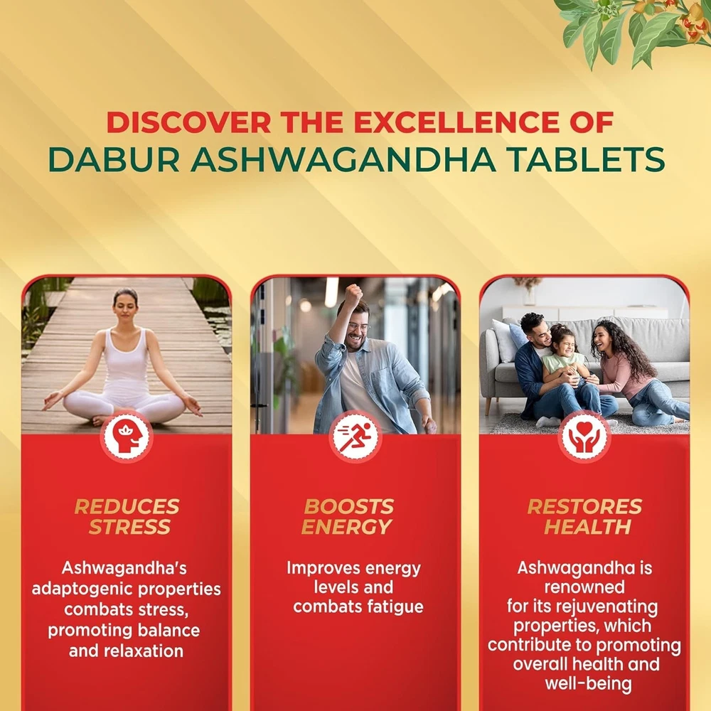 Product description With over 130 years of expertise in ayurveda, dabur has always been committed to the health and well-being of every household. Power packed with the age-old wisdom of ayurveda, dabur pure herbs range of tablets is the latest offering from the house of dabur in fulfilling this vision. The immunity boosting dabur ashwagandha tablets in our range have the goodness of ashwagandha in it. Dabur Ashwagandha Tablets are 100 % Ayurvedic Immunity booster tablets that help strengthen your immunity. Ashwagandha is an immunomodulator that helps boost the immunity and it also has antioxidant properties. Ashwagandha also helps with general weakness and in relieving stress levels, thereby making it a perfect choice for your overall health. For best results, take one tablet twice everyday with water (or as directed by the physician) From the manufacturer