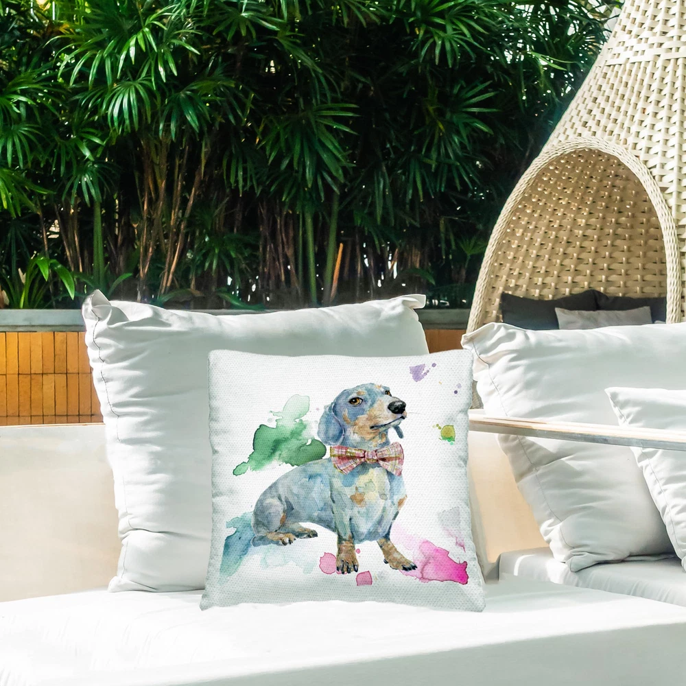 Dimensions: 18 x 18 Inches, Including Filling Insert Decorative outdoor pillows are a great and easy way to decorate your outdoor living space, adding both a decorative accent and comfort. Pillows arrive with insert already zipped inside and ready to fluff. Casing and filling insert are both made of quick-dry soft polyester material. The printing process makes the ink part of the fabric for greater outdoor durability. To wash remove filling insert from casing using invisible zipper. Clean pillow case separately, machine wash on delicate with cold water and mild detergent. For best quality hang dry. Pillow insert is spot clean only. Artwork Relates To: Animal, Canine, Dog, Mammal, Pet, Puppy, Bow Tie Design by Livi and Finn
