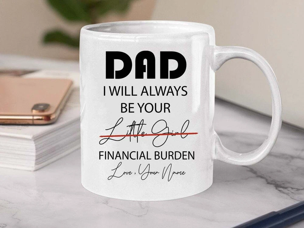 Dad I Will Always Be Your Financial Burden Mug Personalized Mug Dad Coffee Mugs Product Details.. This high quality 11oz. ceramic white mug has a premium hard coat that provides crisp and vibrant color reproduction sure to last for years. Perfect for all hot & cold beverages. The highest quality printing possible is used. It will never fade no matter how many times you wash it. Material: 100% Ceramic. Print both sides. Dishwasher and Microwave Safe. High Gloss + Premium White Finish. Printed in the U.S.A. Personalized & Custom. We support personalized and custom mug to add custom, when placing an order, you can add notes to the "order note" in shipping address section. Also you can contact us directly via message. Shipping Info. Ready to ship in 1 to 2 business days, All products are made-to-order and proudly printed in the United States. Shipped by USPS and DHL, You will receive your order in 5-7 days. Replace & Refund. All products are defective during shipping broken, chipped will be replaced free of charge. You are not satisfied with the product, we will refund 100% money to you. If any other issues arise, please do not hesitate to message, we would be more than happy to assist you.