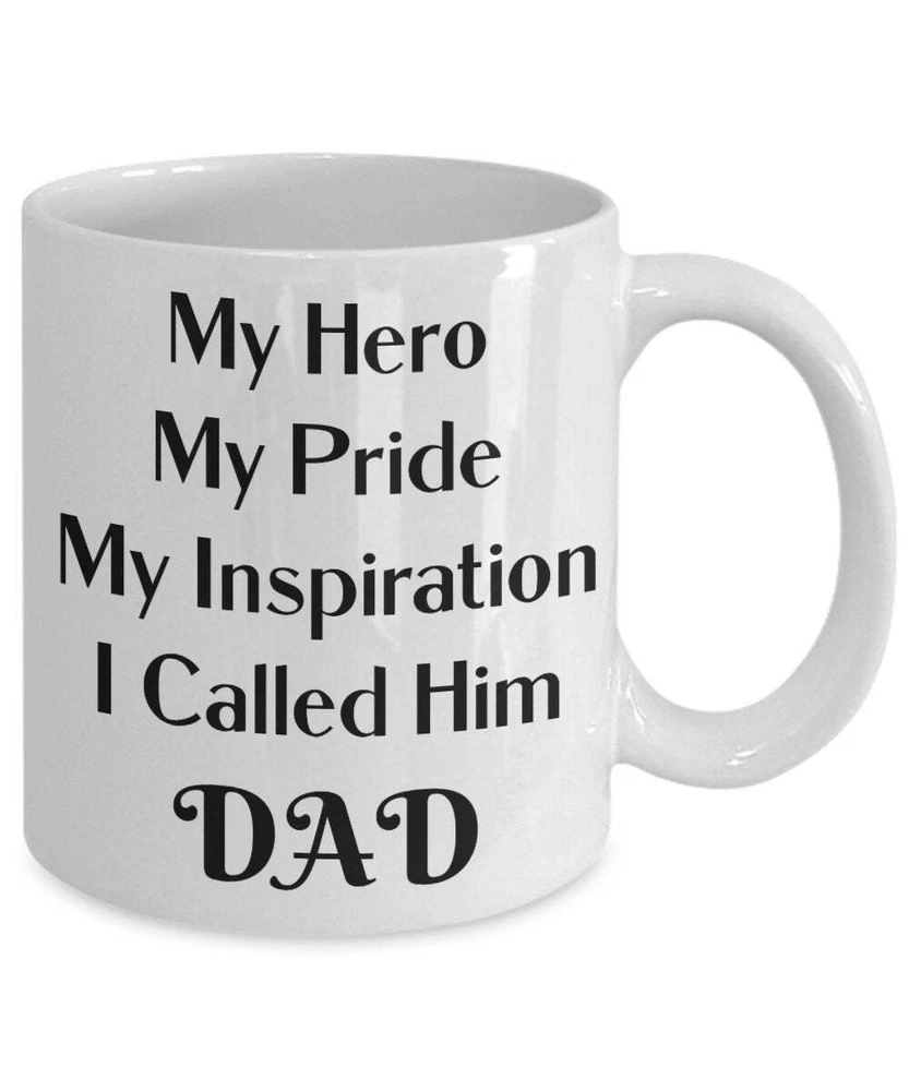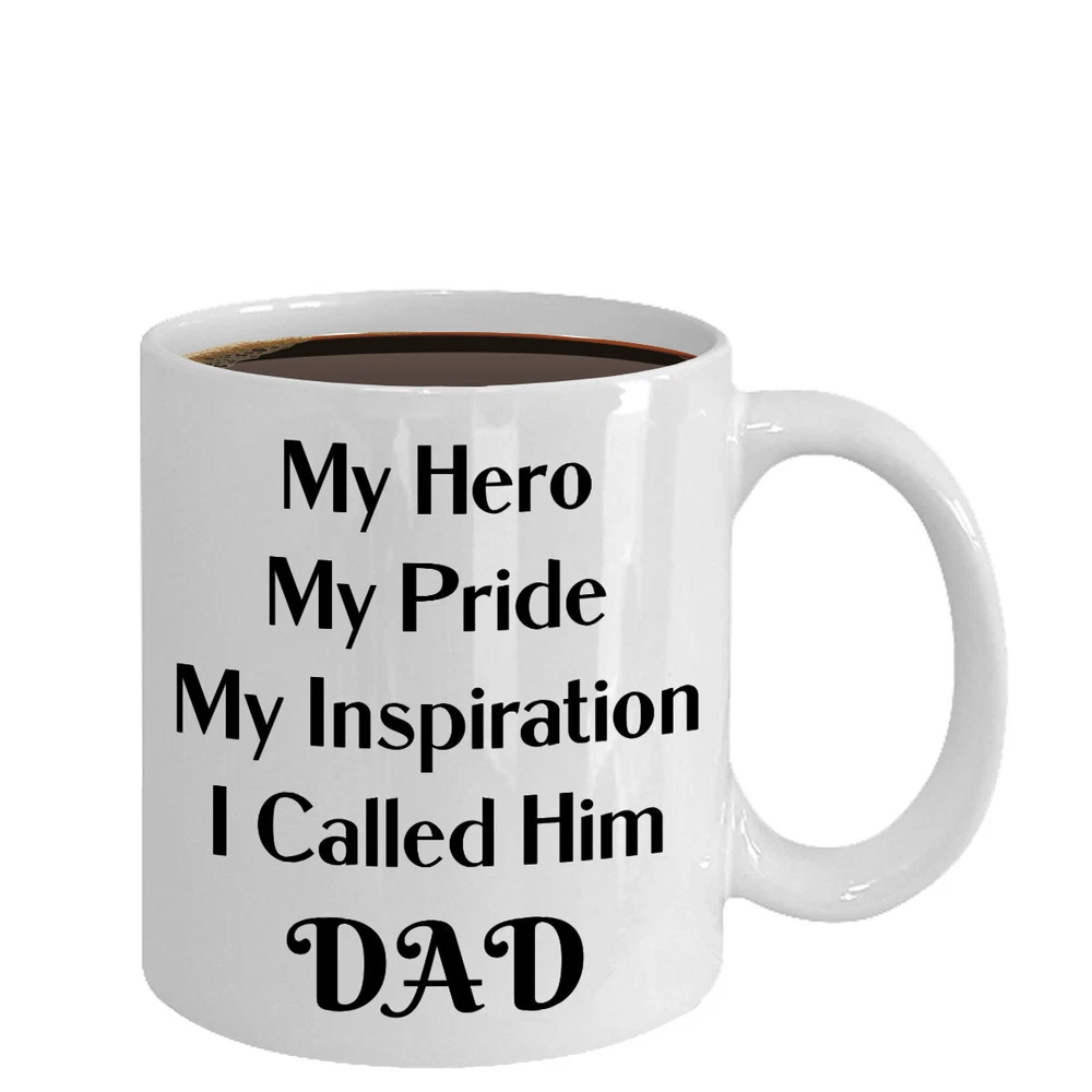 Dad Mug My Hero My Pride Dad Mug Father's Day Gift From Daughter Dad Mug Gift Product Details.. This high quality 11oz. ceramic white mug has a premium hard coat that provides crisp and vibrant color reproduction sure to last for years. Perfect for all hot & cold beverages. The highest quality printing possible is used. It will never fade no matter how many times you wash it. Material: 100% Ceramic. Print both sides. Dishwasher and Microwave Safe. High Gloss + Premium White Finish. Printed in the U.S.A. Personalized & Custom. We support personalized and custom mug to add custom, when placing an order, you can add notes to the "order note" in shipping address section. Also you can contact us directly via message. Shipping Info. Ready to ship in 1 to 2 business days, All products are made-to-order and proudly printed in the United States. Shipped by USPS and DHL, You will receive your order in 5-7 days. Replace & Refund. All products are defective during shipping broken, chipped will be replaced free of charge. You are not satisfied with the product, we will refund 100% money to you. If any other issues arise, please do not hesitate to message, we would be more than happy to assist you.