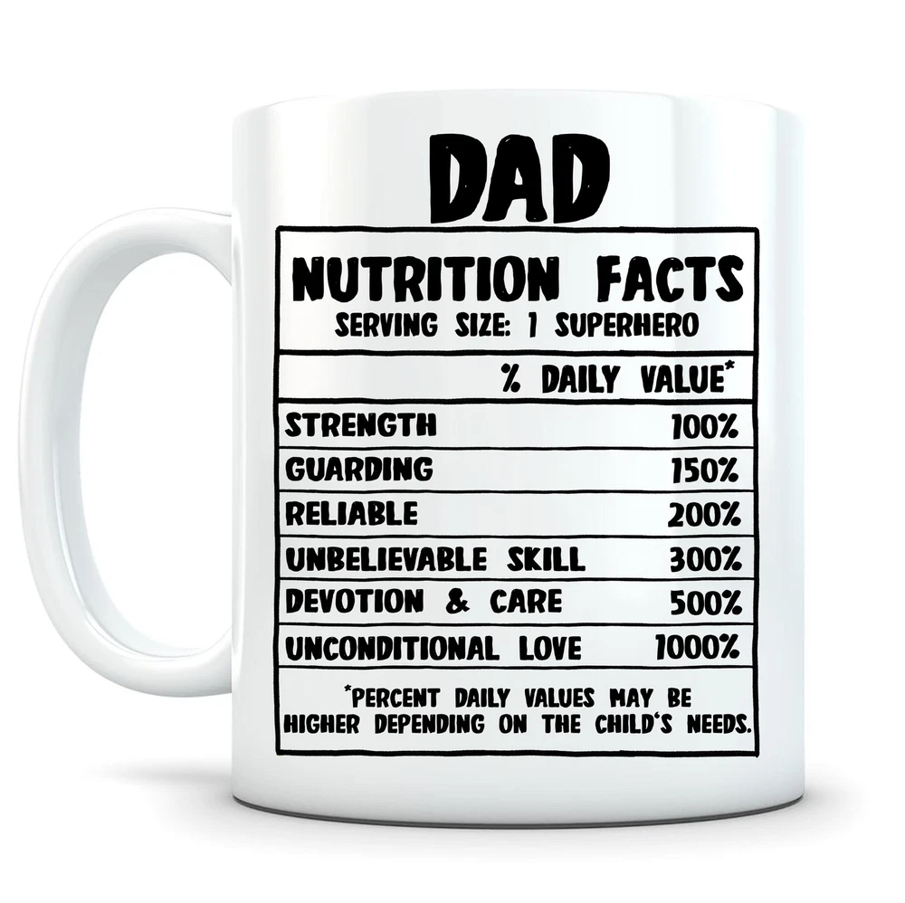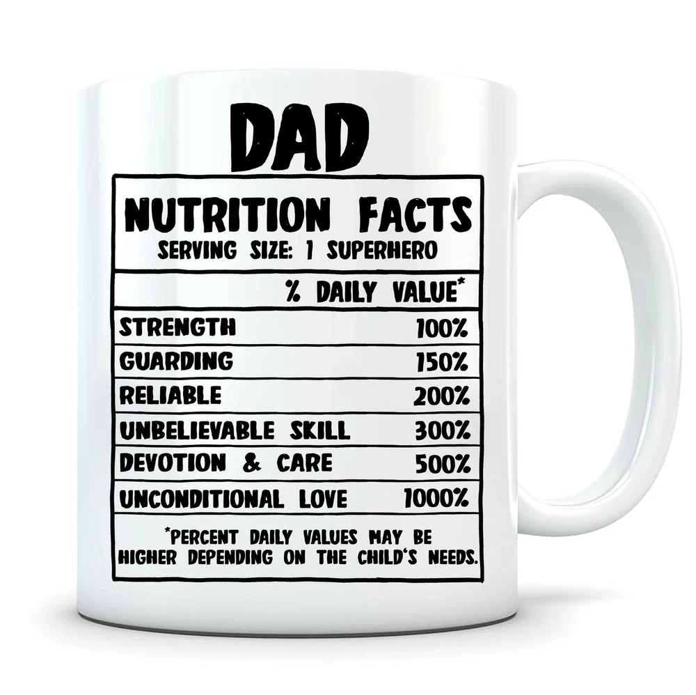 Dad Nutrition Facts Mug Dad Coffee Mugfunny Dad Mug Best Dad Mug Dad Gift From Product Details.. This high quality 11oz. ceramic white mug has a premium hard coat that provides crisp and vibrant color reproduction sure to last for years. Perfect for all hot & cold beverages. The highest quality printing possible is used. It will never fade no matter how many times you wash it. Material: 100% Ceramic. Print both sides. Dishwasher and Microwave Safe. High Gloss + Premium White Finish. Printed in the U.S.A. Personalized & Custom. We support personalized and custom mug to add custom, when placing an order, you can add notes to the "order note" in shipping address section. Also you can contact us directly via message. Shipping Info. Ready to ship in 1 to 2 business days, All products are made-to-order and proudly printed in the United States. Shipped by USPS and DHL, You will receive your order in 5-7 days. Replace & Refund. All products are defective during shipping broken, chipped will be replaced free of charge. You are not satisfied with the product, we will refund 100% money to you. If any other issues arise, please do not hesitate to message, we would be more than happy to assist you.