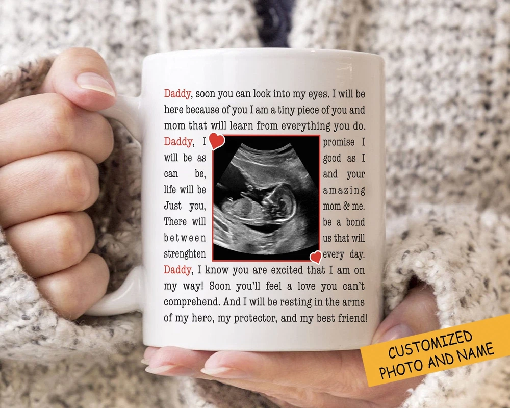 Daddy Words Personalized Mug Ultrasound Photo Mug Fathers Day Gift Baby Bump Mug Product Details.. This high quality 11oz. ceramic white mug has a premium hard coat that provides crisp and vibrant color reproduction sure to last for years. Perfect for all hot & cold beverages. The highest quality printing possible is used. It will never fade no matter how many times you wash it. Material: 100% Ceramic. Print both sides. Dishwasher and Microwave Safe. High Gloss + Premium White Finish. Printed in the U.S.A. Personalized & Custom. We support personalized and custom mug to add custom, when placing an order, you can add notes to the "order note" in shipping address section. Also you can contact us directly via message. Shipping Info. Ready to ship in 1 to 2 business days, All products are made-to-order and proudly printed in the United States. Shipped by USPS and DHL, You will receive your order in 5-7 days. Replace & Refund. All products are defective during shipping broken, chipped will be replaced free of charge. You are not satisfied with the product, we will refund 100% money to you. If any other issues arise, please do not hesitate to message, we would be more than happy to assist you.