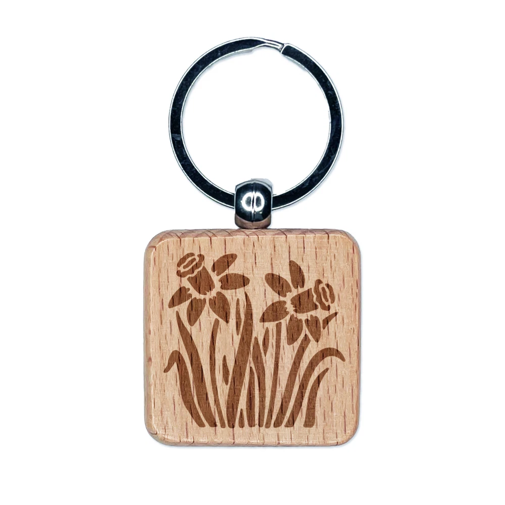 Daffodil Flowers Engraved Wood Square Keychain Tag Charm