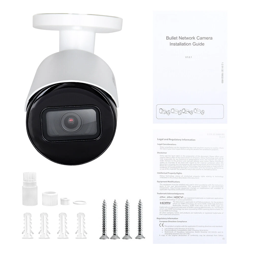 Product Description 4MP Lite IR Fixed-focal Bullet Network Camera Features: 4MP, 1/3” CMOS image sensor, low illuminance, high image definition Outputs 4MP (2560 × 1440)@25/30fps, Max. supports 4MP (2688 × 1520)@20 fps H.265 codec, high compression ration, ultra-low bit rate Built-in IR LED, max IR distance: 30 m ROI, SMART H.264+/H.265+, flexible coding, applicable to various bandwidth and storage environments Rotation mode, WDR, 3D NR, HLC, BLC, digital watermarking, applicable to various monitoring scenes Intelligent detection: Intrusion, tripwire Abnormality detection: Motion detection, video tampering, no SD card, SD card full, SD card error, network disconnected, IP conflict, illegal access, voltage detection Supports max. 256 GB Micro SD card 12V DC/PoE power supply IP67 protection Specifications: Camera Image Sensor 1/3” 4Megapixel progressive CMOS Max. Resolution 2688 (H) × 1520 (V) ROM 128 MB RAM 128 MB Scanning System Progressive Electronic Shutter Speed Auto/Manual 1/3 s–1/100000 s S/N Ratio > 56 dB Min. Illumination 0.008 Lux@F1.6 Illumination Distance 30 m (98.43 ft) Illuminator On/Off Control Auto/Manual Illuminator Number 1 ( IR LED ) Pan/Tilt/Rotation Range Pan: 0°–360° Tilt: 0°–90° Rotation: 0°–360° Lens Lens Type Fixed-focal Mount Type M12 Focal Length 2.8 mm 3.6 mm Max. Aperture F1.6 F1.6 Field of View 2.8 mm: Horizontal:102.0° × Vertical 55.0° × Diagonal 121.0° 3.6 mm : Horizontal 84.0° × Vertical 45.0° × Diagonal 100.0° Iris Type Fixed Close Focus Distance 2.8 mm: 0.9 m (2.95 ft) 3.6 mm: 1.6 m (3.61 ft) DORI Distance Lens Detect Observe Recognize Identify 2.8 mm 56 m (183.73 ft) 22.4 m (73.49 ft) 11.2 m (36.75 ft) 5.6 m (18.37 ft) 3.6 mm 80 m (262.47 ft) 32.0 m (104.99 ft) 16.0 m (52.49 ft) 8.0 m (26.25 ft) Smart event IVS Tripwire; intrusion Video Video Compression H.265; H.264; H.264B; MJPEG(only supported by sub stream) Smart Codec Smart H.265+/ Smart H.264+ Video Frame Rate Main stream: 2688 × 1520 (1 fps-20 fps) 2560 × 1440 (1 fps-25/30 fps) Sub stream: 704 × 576 (1 fps-25 fps) 704 × 480 (1 fps-30 fps) Stream Capability 2 streams Resolution 2688 × 1520 (2688 × 1520); 2560 × 1440 (2560 × 1440); 2304 × 1296 (2304 × 1296); 1080p (1920 × 1080); 1.3M (1280 × 960); 720p (1280 × 720); D1 (704 × 576/704 × 480); VGA (640 ×480); CIF (352 × 288/352 × 240) Bit Rate Control CBR/VBR Video Bit Rate H.264: 32 kbps–6144 kbps H.265: 12 kbps–6144 kbps Day/Night Auto(ICR)/Color/B/W BLC Yes HLC Yes WDR 120 dB White Balance Auto/natural/street lamp/outdoor/manual/regional custom Gain Control Auto/Manual Noise Reduction 3D NR Motion Detection OFF/ON (4 areas, rectangular) Region of Interest(RoI) Yes (4 areas) Smart Illumination Yes Image Rotation 0°/90°/180°/270° (Supports 90°/270° with 2688 × 1520 resolution and lower.) Mirror Yes Privacy Masking 4 areas Alarm Alarm Event No SD card; SD card full; SD card error; network disconnection; IP conflict; illegal access; motion detection; video tampering; tripwire; intrusion; voltage detection; security exception Network Network RJ-45 (10/100 Base-T) SDK and API Yes Cyber Security Video encryption; firmware encryption; configuration encryption; Digest; WSSE; account lockout; security logs; IP/MAC filtering; generation and importing of X.509 certification; syslog; HTTPS; 802.1x; trusted boot; trusted execution; trusted upgrade Protocol IPv4; IPv6; HTTP; HTTPS; TCP; UDP; ARP; RTP ; RTSP; RTCP; RTMP; SMTP; FTP; SFTP; DHCP; DNS; DDNS; QoS; UPnP; NTP; Multicast; ICMP; IGMP; NFS; PPPoE; 802.1x; Bonjour Interoperability ONVIF(Profile S/Profile G/Profile T);CGI; P2P; Milestone; Genetec User/Host 20 Storage FTP; SFTP; Micro SD Card (support max. 256 GB); NAS Browser IE Chrome Firefox Management Software Smart PSS; DSS; DMSS Mobile Phone IOS; Android Certification Certifications CE-LVD: EN62368-1 CE-EMC: Electromagnetic Compatibility Directive 2014/30/EU FCC: 47 CFR FCC Part 15, Subpart B UL/CUL: UL60950-1 CAN/CSA C22.2 No.60950-1-07 Power Power Supply 12V DC/PoE (802.3af) Power Consumption < 5W Environment Operating Conditions -40°C to +60°C (-40°F to +140°F)/less than ≤ 95% RH Strorage Conditions -40°C to +60°C (-40°F to +140°F) Protection IP67 Structure Casing Metal Dimensions 166.2 mm × Φ70 mm (6.54" × Φ2.76") Net Weight 0.48 kg (1.1 lb) Gross Weight 0.57 kg (1.3 lb) Shipping & Handling: Warranty & Return Policy: Feedback & About Us: About Customs duty/Tax: 1. Item will be shipped out within 5 business days after the payment. Please check and make sure your address is correct before payment. (In order to make sure you can receive the items successfully, please provide your phone number as well.) 2. The items will be shipped via Post Office Airmail. It usually takes around 2 to 3 weeks to United Stated, United Kingdom, Australia, Canada and some European countries. But for other countries, it may need 4-6 weeks to deliver the parcel. It may take longer time if there is abnormal weather condition or customs control issue. Please kindly contact us for refund or assistance if the item doesn’t receive during the time. (If you want a faster service, please contact us before your bidding or purchase.) 3. Please contact us for further assistance if you don't receive the item on time. (Before opening up any "Item not received" dispute/claim, please contact us for a full refund if you don't get the package 35 days after your cleared payment.) 1. All items will be tested or checked carefully and packaged in good condition before sending out to you. Some faulty items might happen especially after overseas transportation. We offer a replacement warranty within 30 days from the date of receipt. 2. You will be responsible for the returning shipping cost, and we will ship the replacement at our cost after receiving the returned item. Please contact us for details before sending the item back to us. Replacement or refund will be issued after the items are received by us. 1. We will automa