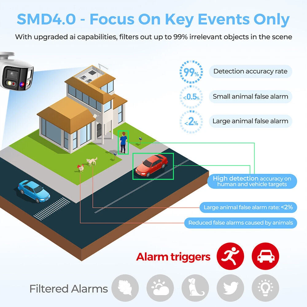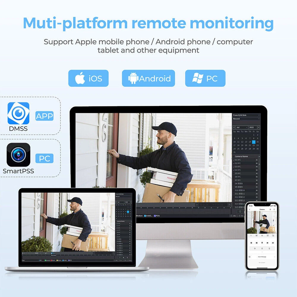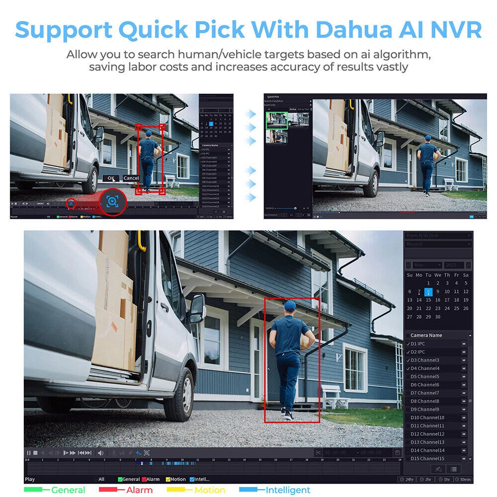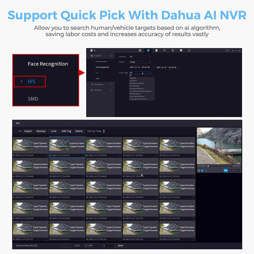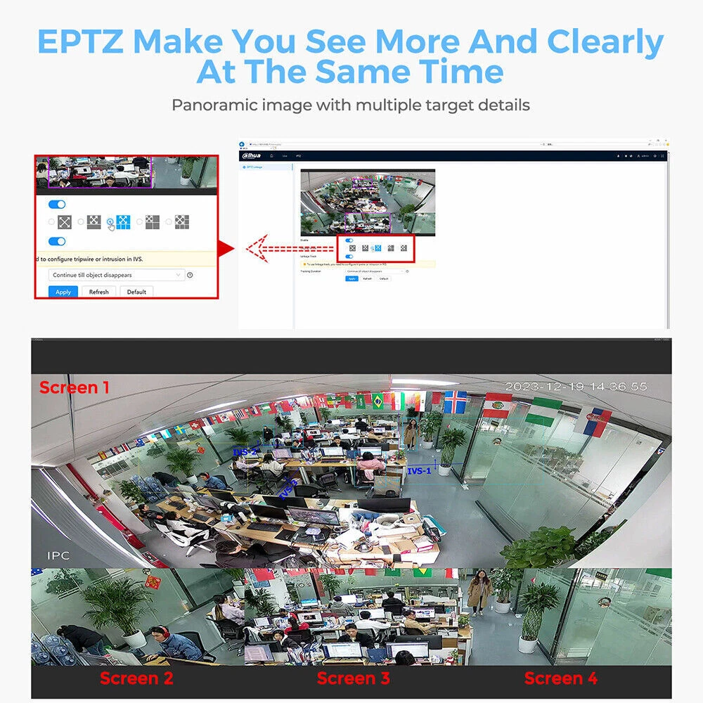 Product Description Note*: Original Dahua English version and Firmware upgradeable. Features > Outputs 180° wide angle splicing image. > Outputs max. 8 MP (4096 × 1860) 20 fps. > H.265 codec, high compression rate, ultra-low bit rate. > Built-in IR LED and warm light, the max. IR illumination distance is 25 m and warm light distance is 20m. > ROI, SMART H.264 +/H.265+, AI H.264/H.265, flexible coding, applicable to various bandwidth and storage environments. > WDR, 3D NR, HLC, BLC, digital watermarking, applicable to various monitoring scenes. > Alarm: 1 in, 1 out; audio: 1 in, 1 out; supports max. 256 G Micro SD card; built in dual Mic; built in speaker, support two-way talk. > 12 VDC/PoE power supply, easy for installation. > IP67 protection. > Sound and light alarm (red and blue lights) > EPTZ: Enlarge and track the targets of intelligent alarms. > SMD 4.0. > One-tap arming/disarming through alarm input. System Overview Dahua WizSense 3 Series Network Camera greatly saves on bandwidth and storage space through its AI Coding technology. Driven by its advanced deep learning algorithms, the camera supports intelligent functions such as perimeter protection, smart motion detection (SMD), Quick Pick, making it easy and convenient to use. Starlight technology and its large aperture lens also allow the camera to produce clear, vivid images even in poor lighting conditions. Functions Siren and Light Active Deterrence Dahua siren and light active deterrence network camera supports the light alarm and voice alarm when perimeter event occurs, to realize the deterrence and effective intervention. The camera is built in multiple voices for selection, and supports customized voice importing. Smart Dual Light Dahua Smart Dual Light technology adopts smart algorithm to detect targets. Usually, the IR illuminator is on at night; when the target appears in the monitoring area, the warm light is on, and the camera records the full-color video and information of key events. That is, the camera links snapshot and video with full-color image. When the target is out of the monitoring area, the warm light is off and the IR illuminator is on, which reduces light pollution efficiently. SMD 4.0 Dahua Smart Motion Detection technology works with intelligent algorithms to classify targets that trigger motion detection alarms. It filters out objects that are not targets, such as small and large animals, to avoid triggering false alarms. With an AI NVR, Quick Pick technology becomes available, allowing you to easily search for and pick out human and vehicle targets from SMD event videos, prioritizing the highest matches. EPTZ With advanced target detection and tracking algorithms, Dahua EPTZ technology can simultaneously zoom in and track multiple humans and vehicles that trigger alarms. It provides rich details and a panoramic view at the same time One-tap Disarming Dahua One-tap Disarming function, which is convenient and easy for operation, is the switch for event linkage. Customers can close and recover event linkage through mobile App, which meets multi-scenarios needs. Cyber Security Dahua network cameras employ a series of security technologies, including security authentication and authorization, access control protocols, trusted protection, encrypted transmission and encrypted storage. These technologies improve the camera's defense against external cyber threats and prevent malicious programs from compromising the device. Protection (IP67, wide voltage) IP67: The camera passes a series of strict test on dust and soak. It has dust-proof function, and the enclosure can work normally after soaking in 1 m deep water for 30 minutes. Wide voltage: The camera allows ±30% input voltage tolerance (wide voltage range), and it is widely applied to outdoor environment with instable voltage Specifications Camera Image Sensor Dual 1/2.7" CMOS Max. Resolution 4096 (H) × 1860 (V) ROM 128 MB RAM 1 GB Scanning System Progressive Electronic Shutter Speed Auto/Manual 1/3 s–1/100,000 s Min. Illumination 0.005 lux F1.4 (Color, 30 IRE) 0.0005 lux F1.4 (B/W, 30 IRE) 0 lux (Illuminator on) S/N Ratio >56 dB Illumination Distance Up to 25 m (82.02 ft) (IR LED) Up to 20 m (65.62 ft) (Warm light) Illuminator On/Off Control Auto; Manual Illuminator Number 2 (IR LED); 2 (Warm light) Angle Adjustment Pan: 0°–360° Tilt: 0°–77° Rotation: 0°–360° Lens Lens Type Fixed-focal Lens Mount M12 Focal Length 2.8 mm Field of View Horizontal: 180°; Vertical: 86° Max. Aperture F1.4 Iris Control Fixed Close Focus Distance 0.8 m (2.62 ft) DORI Distance Lens Detect Observe Recognize Identify 2.8 mm 50.6 m (166.01 ft) 20.2 m (66.27 ft) 10.1 m (33.14 ft) 5.1 m (16.73 ft) Intelligence IVS (Perimeter Protection) Intrusion, tripwire (the two functions support the classification and accurate detection of vehicle and human) SMD SMD 4.0 Quick Pick With AI NVR, quickly pick up the human/vehicle targets that users are interested in from SMD events. Smart Search Work together with Smart NVR to perform refine intelligent search, event extraction and merging to event videos. EPTZ Enlarge and track the targets of intelligent alarms Video Video Compression H.265; H.264; H.264H; H.264B; MJPEG (Only supported by the sub stream) Smart Codec Smart H.265+; Smart H.264+ AI Coding AI H.265; AI H.264 Video Frame Rate Main stream: 4096 × 1860 (1–20 fps ) Sub stream: 1200 × 530 (1–20 fps) Third stream: 1920 × 860 (1–20 fps) *The values above are the max. frame rates of each stream; for multiple streams, the values will be subjected to the total encoding capacity. Stream Capability 3 streams Resolution 4096 × 1860; 3632 × 1632; 3040 × 1368; 1200 × 530; 1920 × 860; 960 × 432 Bit Rate Control CBR/VBR Video Bit Rate H.264: 6 kbps –16384 kbps H.265: 6 kbps –16384 kbps Day/Night Auto(ICR)/Color/B/W BLC Yes HLC Yes WDR 120 dB Scene Self-adaptation (SSA) Yes White Balance Auto; natural; street lamp; outdoor; manual; regional custom Gain Control Au
