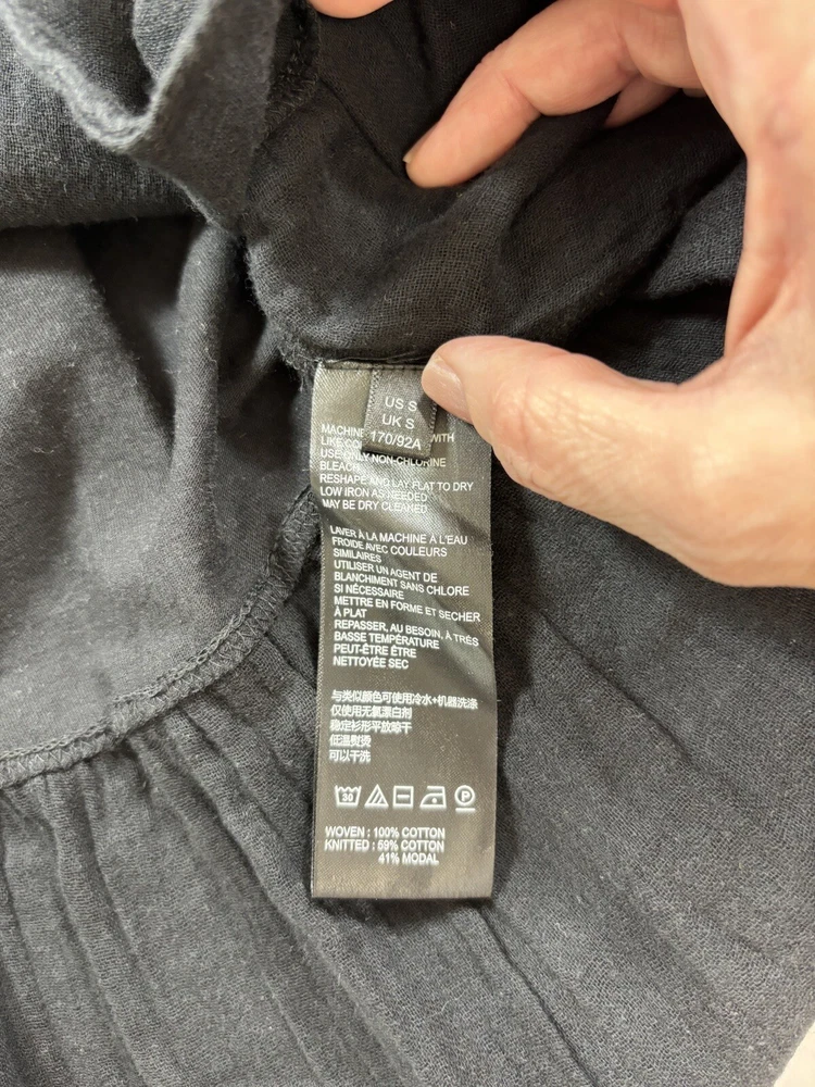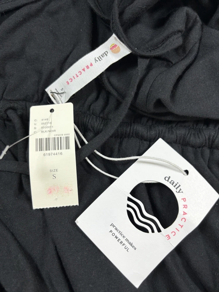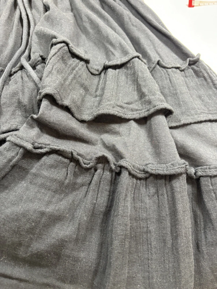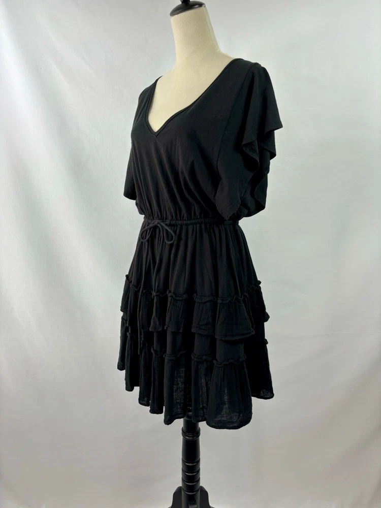 Daily Practice Anthropologie Dress Black Small New Tiered Ruffled Flutter Sleeve Low Back Crinkled fabric ruffles mixed with knit cotton Fabric Content - Woven: 100% cotton, Knitted: 59% cotton, 41% modal Care Instructions - Machine wash, flat dry See photos for condition - brand new, tags still attached Size Small - See photos for measurements G3