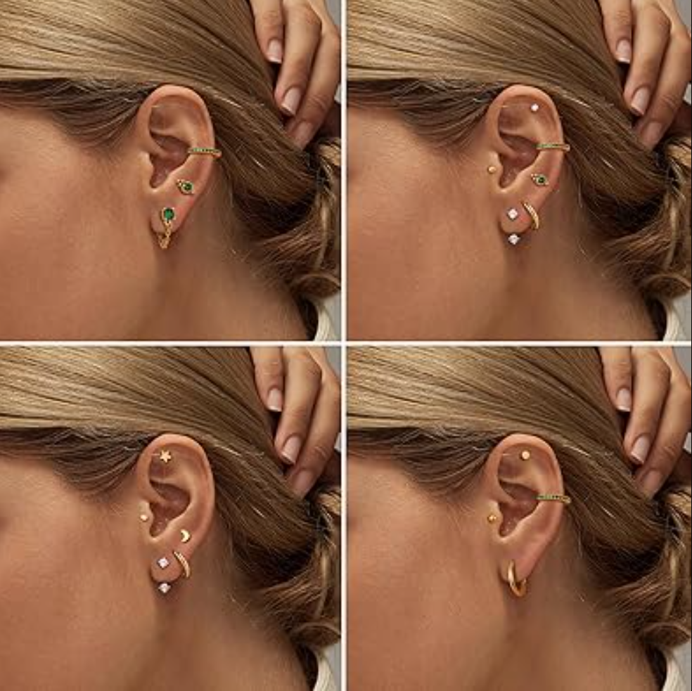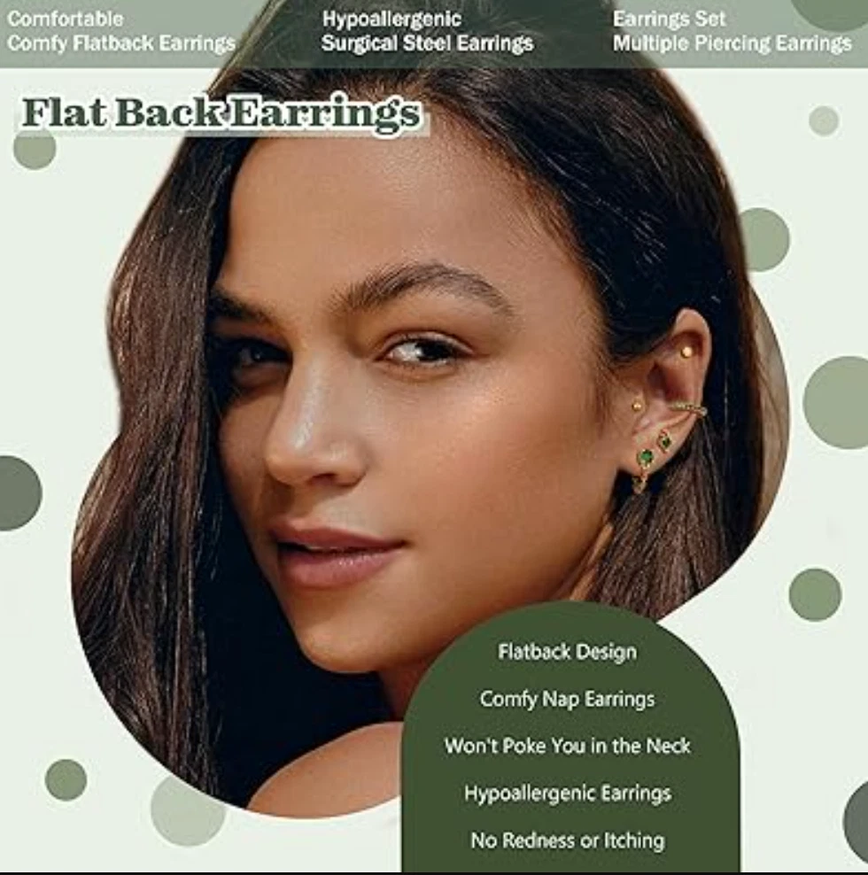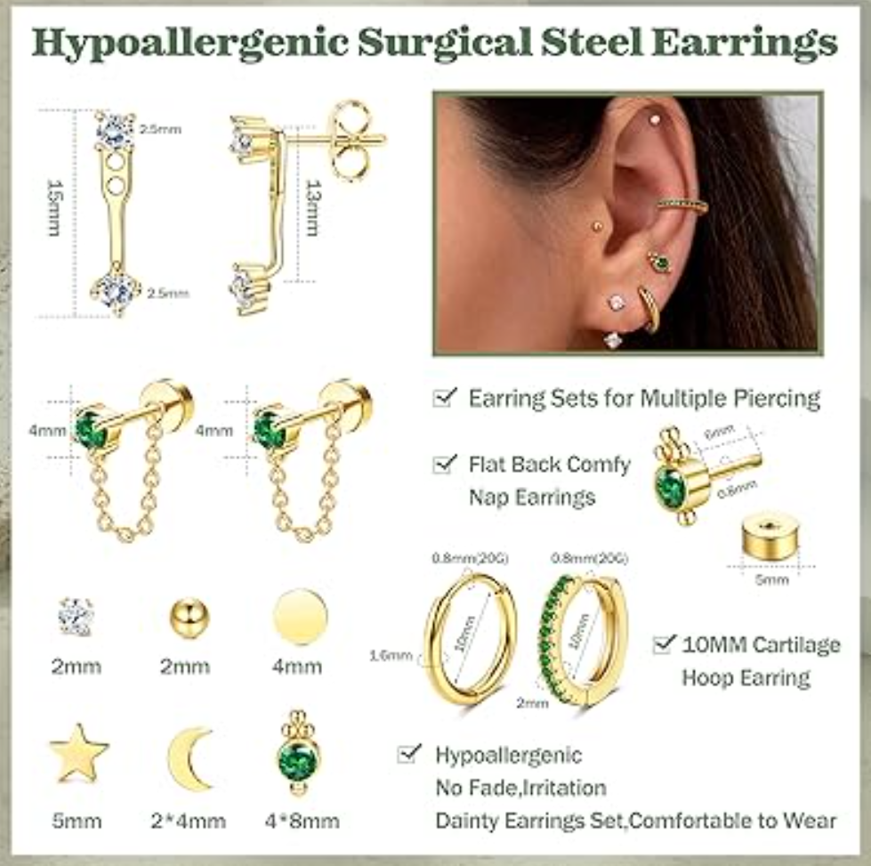Dainty Gold Flat Back Earrings Hypoallergenic Cartilage Earring Sets for Multiple Piercing 20G Surgical Stainless Steel Earrings Trendy Earring Stacks Small Hoop Flatback Stud Earrings Dainty Cartilage Earring Sets for Multiple Piercing--Multipack Gold Cartilage Earring Stacks.10 Pairs hypoallergenic earrings for women.Including 6 pairs gold studs earrings,2 Pairs small huggie hoop earrings,chain dangle earrings and ear jacket earrings.Wrap It around Your Ears,Dainty Earrings for Women Trendy and You Can Match Gold Earrings with Whatever You Want Hypoallergenic Surgical Steel Earrings--Premium 316L Surgical Steel Earrings for Sensitive Ears.Authoritative Structure Certification,NI Release Pass,No Nickle & Lead,No Allergy,No Irritation.Upgraded Vacuum Real 14K Gold Plated,Long Lasting Color Retention,No Rust & No Tarnish Gold Earrings for Women Comfy Flat Back Stud Earrings for Women--Internally Thread Screw Back Flat Back Earrings,Simple to Wear,Not Easy to Fall off.Comfortable Flat Back Earrings,Won't Poke Skin or Hook Hair,You Won't Feel Discomfort Even When Sleeping or Sporting.FLAT BACK EARRINGS-NICE COMFY NAP EARRINGS Trendy Gold Earrings for Women--"Shine Bright, Be Yourself".It's Our Encouragement for Every Customer to Feel Their Distinctive Beauty While Adorning Our Gold Stud Earrings Set.Trendy,Classic,Dainty,Comfy,Hypoallergenic.Therefore,Not Only Can You Give It to Your Friends, But You Can Also Give Yourself A Surprise Small Hoop and Stud Earrings Set Size--Gauge:20G(0.8MM) Pin Thickness,2MM Tiny CZ Ball Stud Earrings,Flat Backs Size:5MM(0.2 In),Huggie Hoop Earrings Inner Dia:10MM(0.4 In).Lightweight and Hypoallergenic Gold Cartilage Earring Sets for Multiple Piercing,Can Be Used As Stud Earrings,Helix Earrings,Daith,Conch,Tragus Piercing Jewelry.Suitable for Earlobe, Second Hole, Third Hole,Hypoallergenic Earrings Set for 3 Holes.Trendy Triple Piercing Earrings Set,Stacking Match Your Own Style