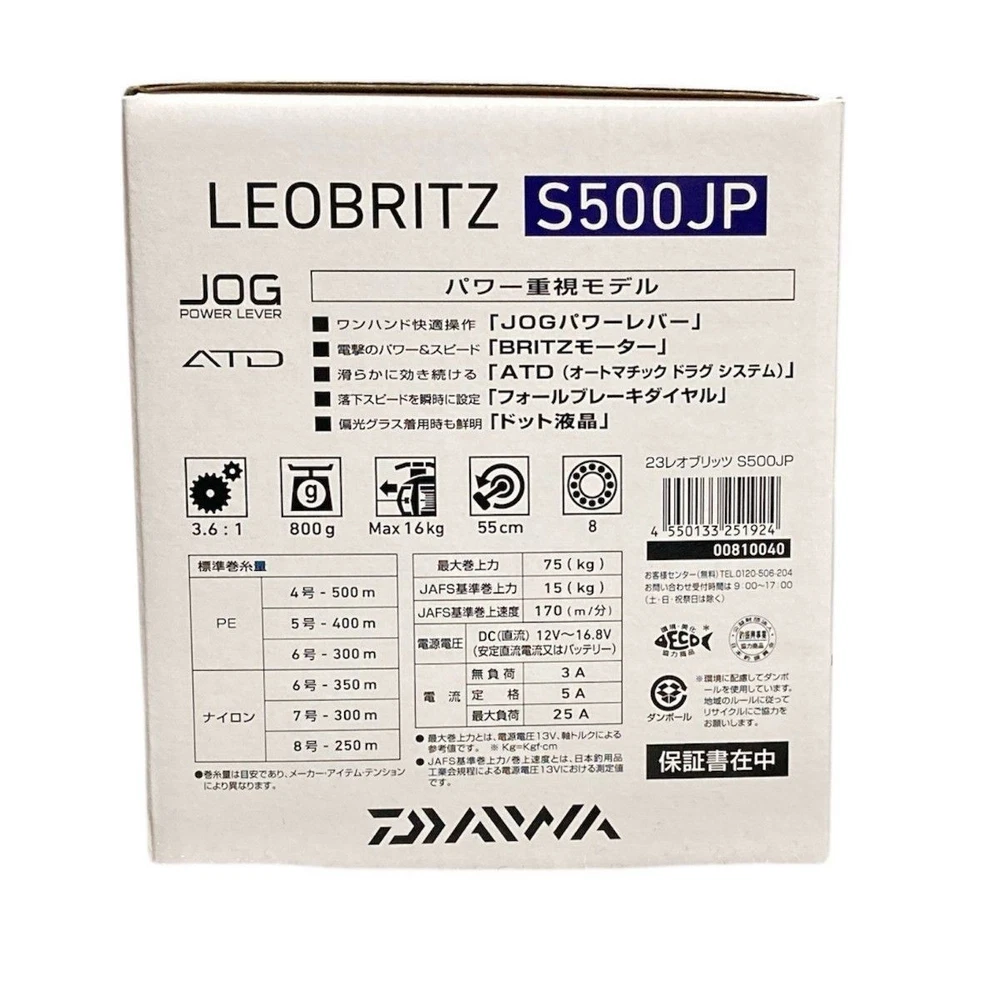 Material: Aluminum, Graphite Vintage: No UPC: 4550133251924 Model: 23 LEOBRITZ S500JP Right Brand: Daiwa Drag Style: Star Drag Features: Big Game, Anti-Reverse, Off-shore Item Weight: 800g Hand Retrieve: Right Fishing Type: Saltwater Fishing MPN: NOT SPECIFIED Personalize: No Number of Pieces: 1 Department: Unisex Adults Pre-Spooled: No Reel Type: Electric Reel Fish Species: All Freshwater, All Saltwater gtin13: 4550133251924 Color: Black Gear Ratio: 3.6:1 Personalized: No Ball Bearings: 8 Product Line: LEOBRITZ