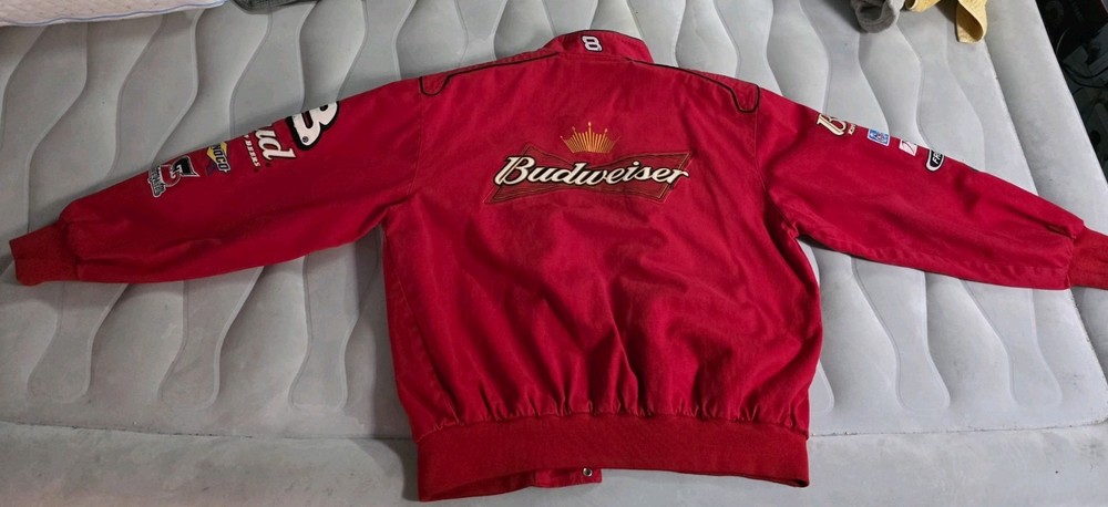 Experience the thrill of NASCAR with this authentic Dale Earnhardt Jr. racing jacket, a must-have for any fan of the sport. Emblazoned with the iconic Budweiser sponsorship and Earnhardt Ganassi Racing graphics, this jacket is a piece of racing memorabilia that celebrates one of the sport's most beloved drivers. Crafted by Chase Authentics and bearing the signature of Dale Earnhardt Jr., this jacket is not only a symbol of fandom but also a comfortable XL size, perfect for race days or casual wear. It's an officially licensed NASCAR product, ensuring its authenticity and quality, and it proudly represents the legacy of a racing legend.