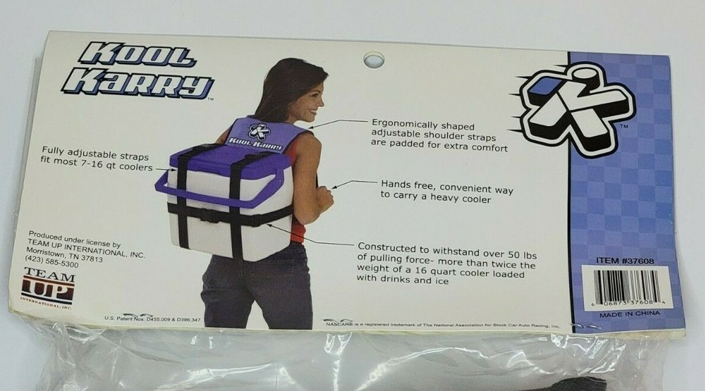 NASCAR Kool Karry Dale Earnhardt Jr Bud Racing Backpack to carry cooler Adjustable straps fit most 7 - 16 quart coolers Ergonomically shaped adjustable shoulder straps are padded for comfort Hands free, convenient way to carry a heavy cooler Constructed to withstand over 50 lbs of pulling force - more than twice the weight of a 16 quart cooler loaded with drinks and ice