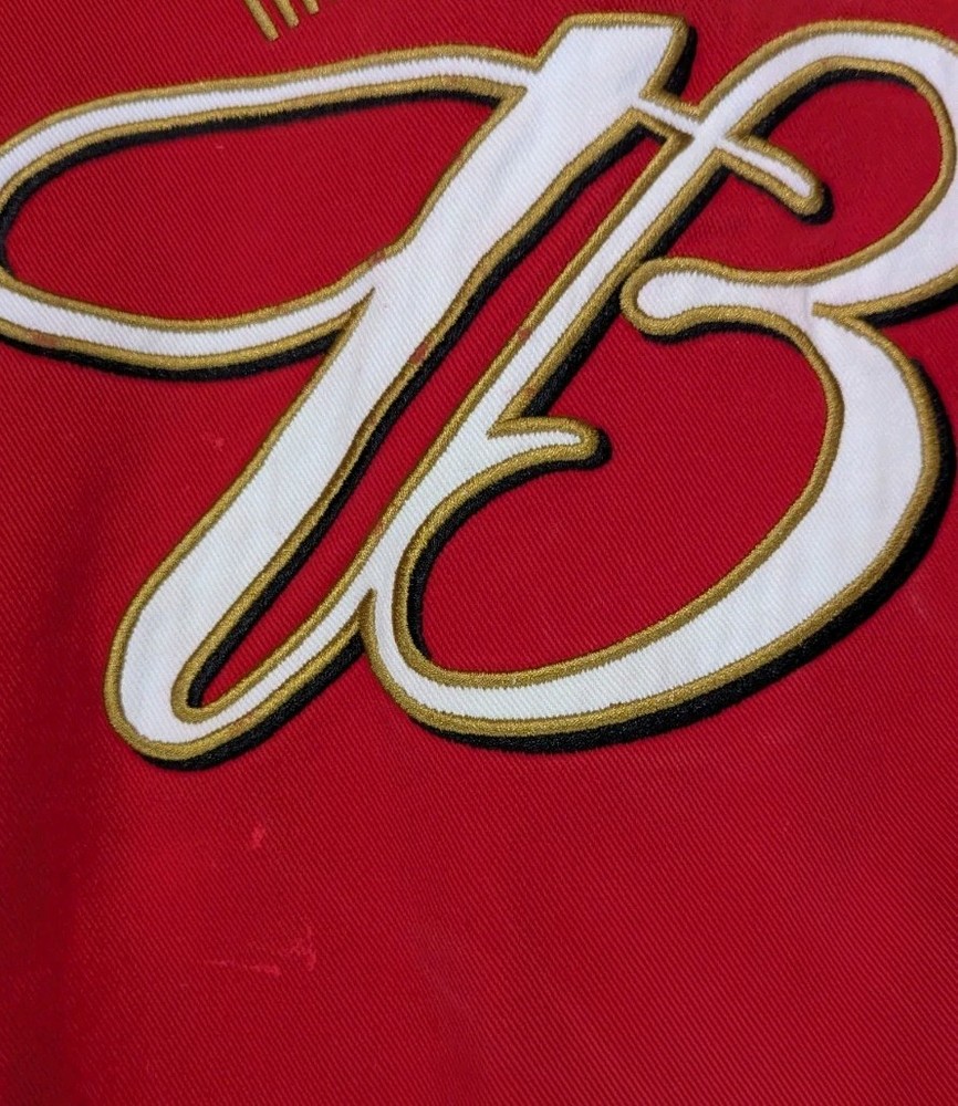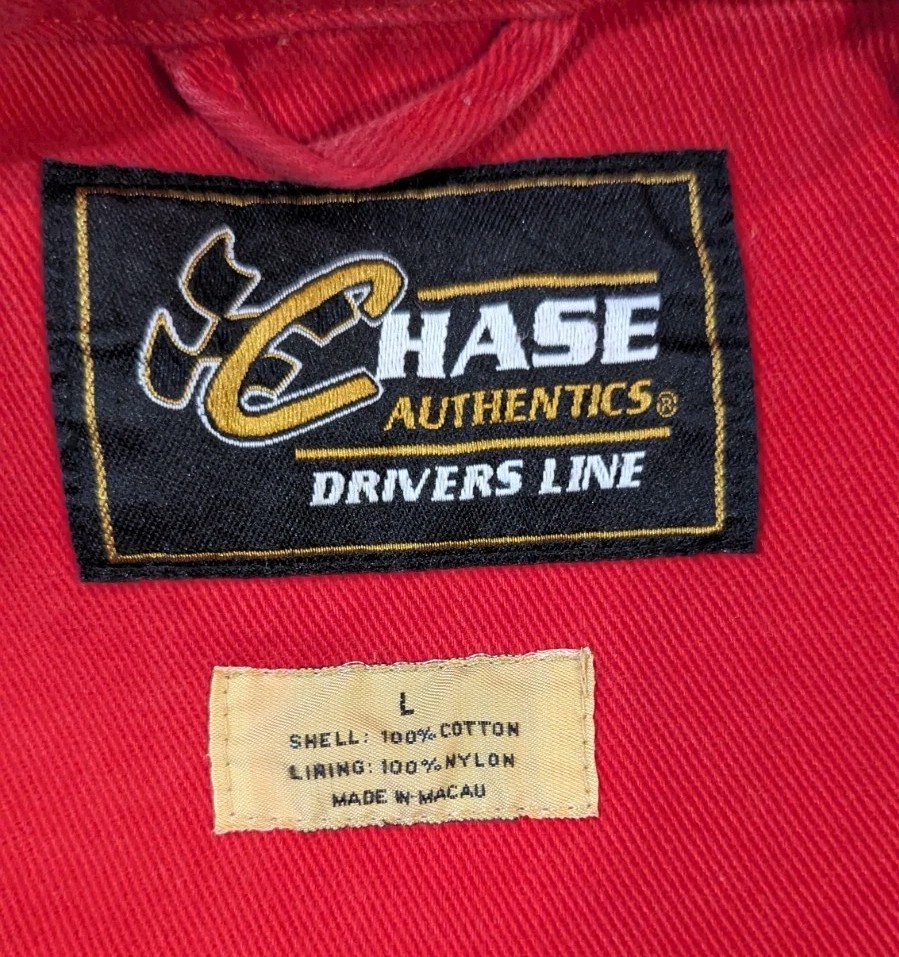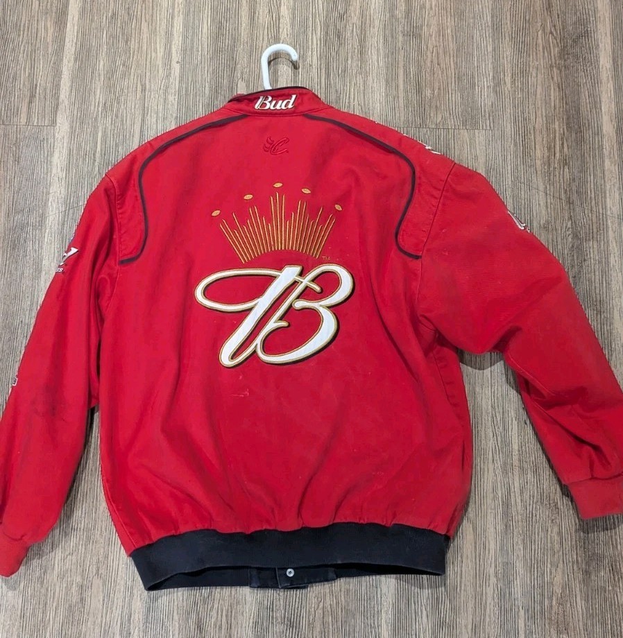This Dale Earnhardt Jr. Nascar Chase Twill Budweiser Men's Jacket is the perfect fan apparel for any NASCAR enthusiast. The jacket features the iconic red color and officially licensed branding, making it a must-have for supporters of Dale Earnhardt Jr and JR Motorsports. Made in China, this large-sized jacket is a stylish and comfortable way to show off your love for the sport and your favorite driver. has small stain on back seen in last photo