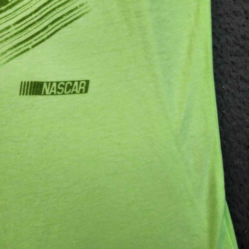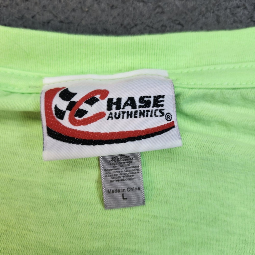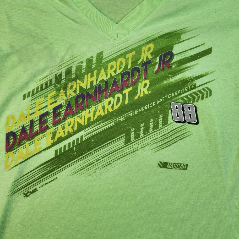 Item: Dale Earnhardt Jr graphic Shirt with large front print and car number 88. Brand: Chase Authentics (licensed) Licensing: © 2015 JRM Licensing, LLC; Hendrick Motorsports and NASCAR logos present on front graphic. Tag size: Womens Large (L) Style: Short sleeve V-neck, fitted women's cut Color: Bright green/lime Material: Not specified on visible tags (fabric content tag not shown in photos) Country of origin: Made in China (per neck tag) Design details: Repeated "Dale Earnhardt Jr." text graphic with 88 and Hendrick Motorsports; NASCAR logo on front. Notes: No UPC/EAN visible in the photos.