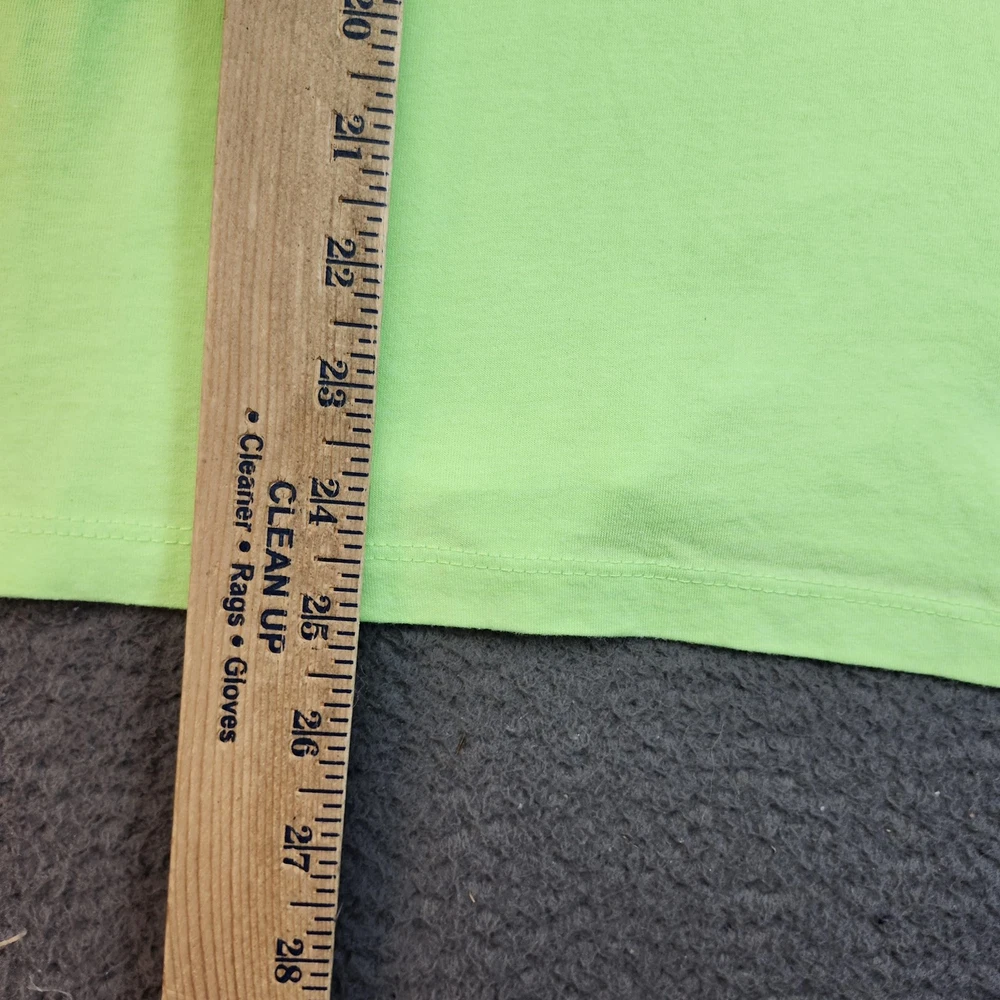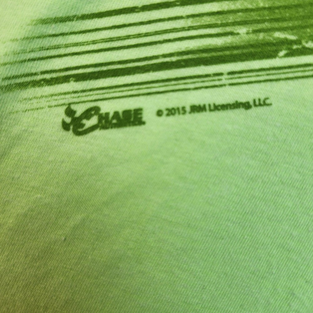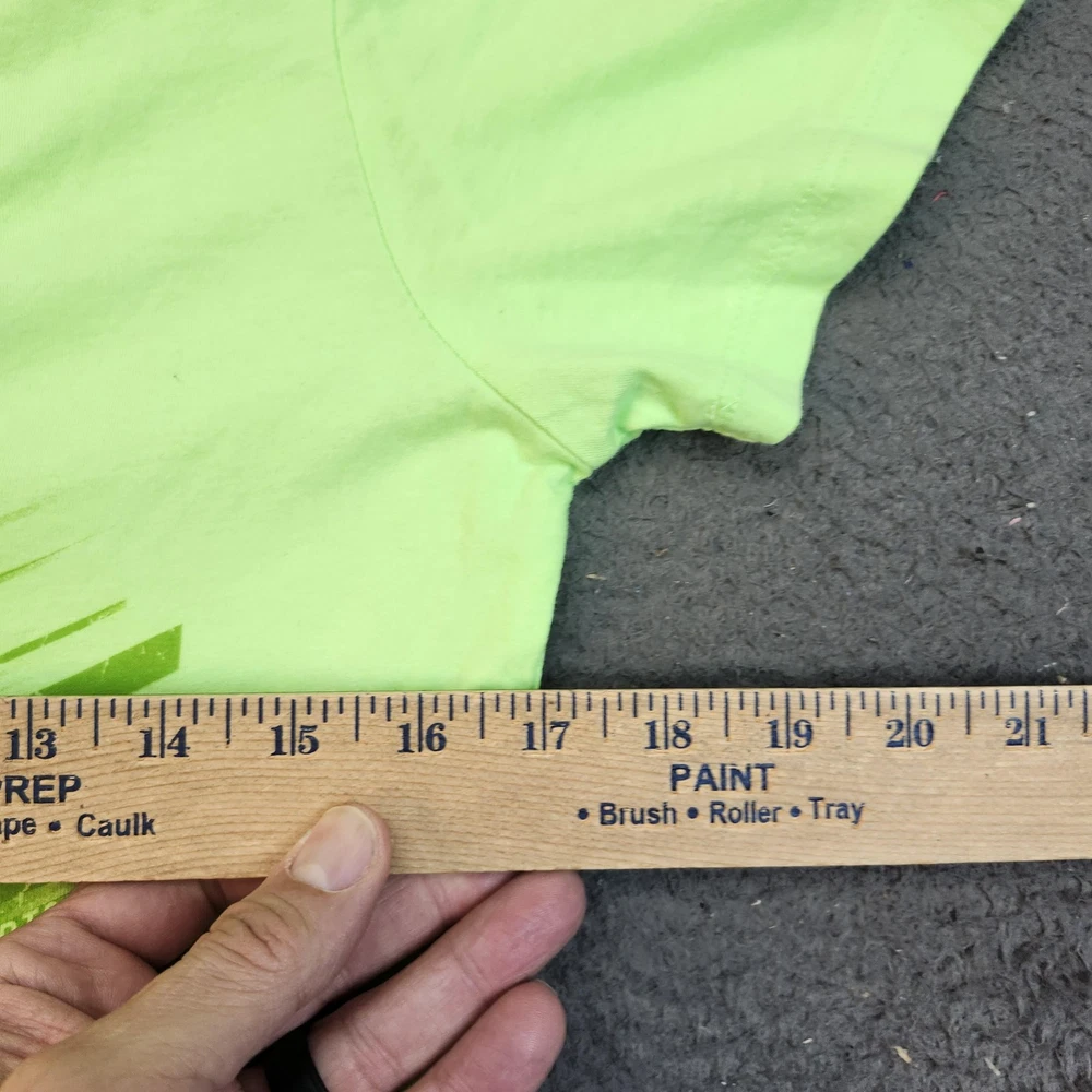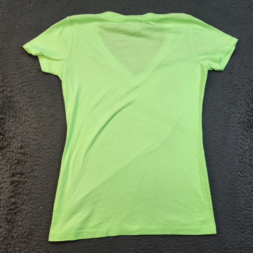 Item: Dale Earnhardt Jr graphic Shirt with large front print and car number 88. Brand: Chase Authentics (licensed) Licensing: © 2015 JRM Licensing, LLC; Hendrick Motorsports and NASCAR logos present on front graphic. Tag size: Womens Large (L) Style: Short sleeve V-neck, fitted women's cut Color: Bright green/lime Material: Not specified on visible tags (fabric content tag not shown in photos) Country of origin: Made in China (per neck tag) Design details: Repeated "Dale Earnhardt Jr." text graphic with 88 and Hendrick Motorsports; NASCAR logo on front. Notes: No UPC/EAN visible in the photos.