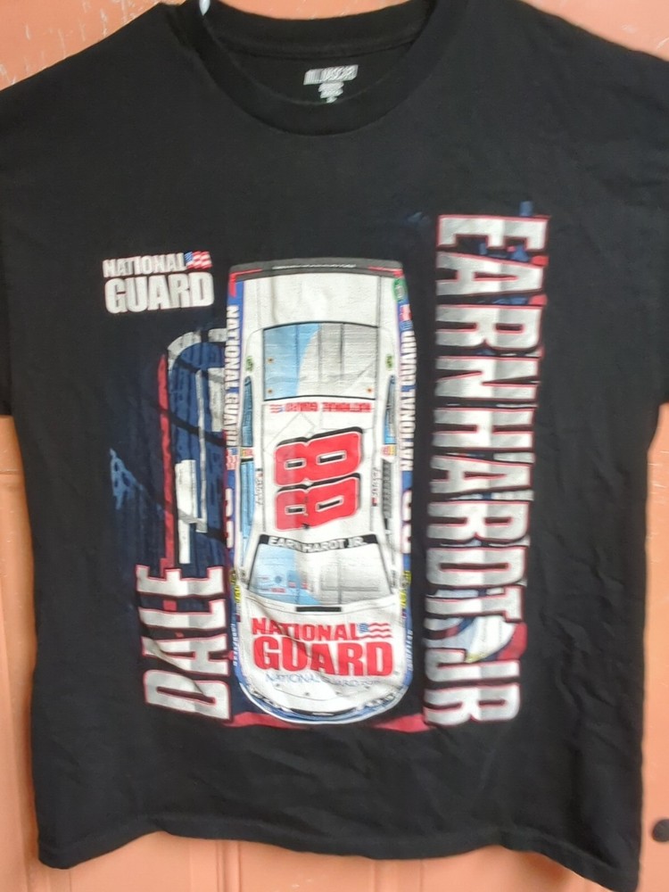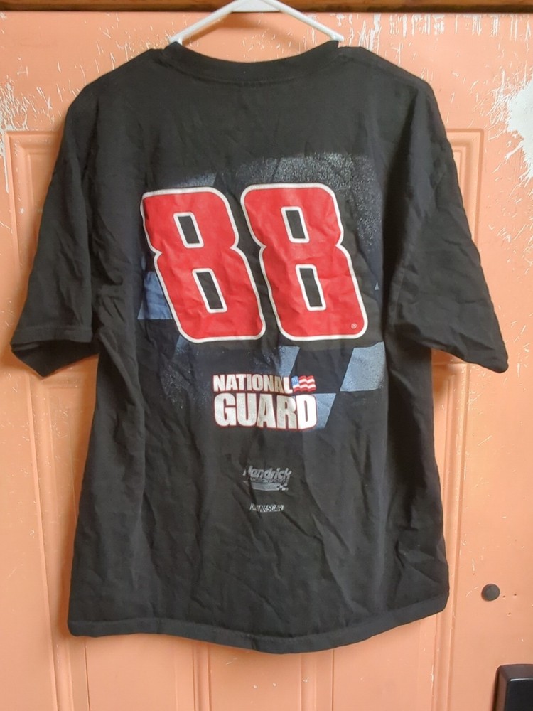 PIT to pit 24 Length 29.5 Show your love for racing and wear this Dale Earnhardt Jr. T-Shirt proudly. This black shirt features the number 88 and the National Guard logo on both sides, making it a great addition to any NASCAR fan's collection. The shirt is sized XL and is designed for men, with a comfortable fit for all-day wear. Representing the Hendrick Motorsports team, this shirt is perfect for showing support for Dale Earnhardt Jr. as he dominated the NASCAR tracks. Made in Mexico and unmodified, this shirt is a must-have for any NASCAR enthusiast. Add this shirt to your collection today!