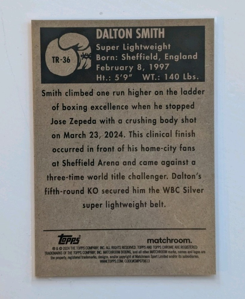 The Dalton Smith Topps Chrome Boxing card is a limited edition gold ringside refractor featuring the World Champion. This rare trading card is part of the 2024 Topps Chrome set and showcases the talented athlete in English language. Made of quality card stock with a 35 Pt. thickness, this original insert card is a valuable addition to any sports memorabilia collection. With the Topps authentication and the player's autograph included in a label or sticker format, this card is a must-have for boxing fans and collectors alike.