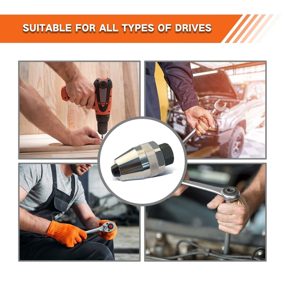 This Damaged Bolt and Stud Extractor Tool has a 3/8-inch drive and works with manual or pneumatic impact wrenches and ratchets to quickly and easily extract damaged bolts and studs remover for 1/4 - 1/2-inch (6 - 12 mm) studs. TOOL SPECIFICATIONS: This Damaged Bolt and Stud Extractor Tool has a 3/8-inch drive and works with manual or pneumatic impact wrenches and ratchets to quickly and easily extract damaged bolts and studs for 1/4 - 1/2-inch (6 - 12 mm) studs STURDY & HEAVY DUTY: This 3/8-inch Damaged Bolt Extractor is heat-treated alloy steel that is extremely strong and chrome-plated so that it won't be damaged by high-intensity work, as well as lubricating the internal rotating threads to provide better protection against rust and wear CUSTOM-MADE: Traditional bolt extractors are limited in size and variety, wasting your space and increasing your cost, while our bolt extractor adopts a universal design with automatic size adjustment, which can easily clamp damaged bolts for stripping, saving you valuable time and cost EFFICIENT MULTI-USE: This stud removal tool is easy to use and will help you get more breaks, whether it's exhaust manifolds, fuel plugs, broken bolts, or broken, painted, or rusted setscrews, all can be effectively removed EASY TO USE: Using this stud removal tool requires little thought; place the stud extractor on the stud and tighten the jaws by turning the bottom hexagonal flat nut counterclockwise. Once the jaws are firmly clamped on the broken bolt or stud, continue to turn the stud counterclockwise until it is removed