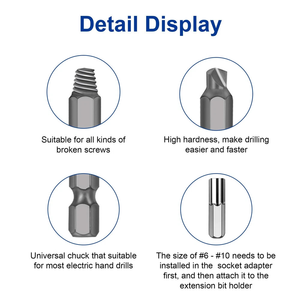 NEW ARRIVAL ⚡⚡⚡ change the traditional ideas and devoted to studying professional broken bolt extractor ✅ High-Speed Steel 4341 ✅ Suitable for general sizes and all kinds of broken bits ✅ Universal chuck that suitable for most electric hand drills ✅ Remove broken screw in one step(Do not need to conversion the extractor or adjust the chuck) How to Use the Screw Extractor? 1. The size of #6 - #10 needs to be installed in the socket adapter first, and then attach it to the extension bit holder (The other sizes can be attached to the extension bit holder directly) 2. Use the drill(Dr) bit to drill a hole in broken screws 3. Change to use the extract(Ex) bit with the same size 4. Reverse use the drill and take out the broken bit Warm Tips : - Must drill a hole first when the break screw surface is smooth. Otherwise the drill bit will slip - Must be vertical and low speed when drilling, reverse use this bit, drill the first hole deeper will easier to take out - It is best to use electric hand drill, can not be used the hammer drill mode! Must be low speed during use! Package Included: 20*Kelepopo damaged screw extractor(Ex#1 - #10, Dr#1 - #10) 1*Magnetic Extension Bit Holder 1*Socket Adapter Kelepopo - Your Professional Tool House We are committed to providing the best quality products, and largely dependent on product feedback from wonderful customers such as yourself. ✦✦✦If you have any questions or concerns about our product, please do not hesitate to contact us, we always here to service you Damaged Screw Extractor : screw extractor is made of high quality High-Speed Steel 4341. High hardness, durable and easily remove damaged screws In one step : The stripped screw extractor set is included two extension bit holder. Can remove in one step, do not need to conversion the extractor or adjust the chuck Extremely Versatile : The stripped screw extractor kit is includes 20 pieces of stripped screw extractor in 10 different sizes to satisfy all you demand. Suitable for any sizes screw or bolt Multipurpose : Suitable for allen bolts, machine screws, lag bolts, wood screws, hex bolts, sheet metal screws and other screws Important : It is best to use electric hand drill, can not be used the hammer drill mode! Must be low speed during use!