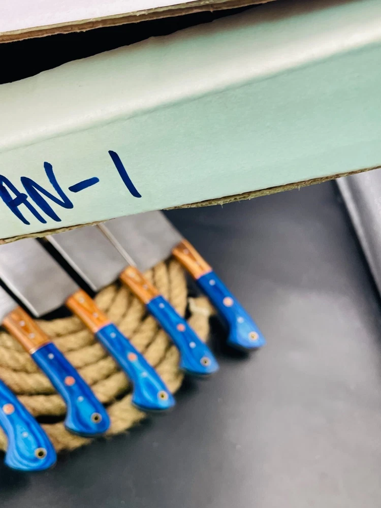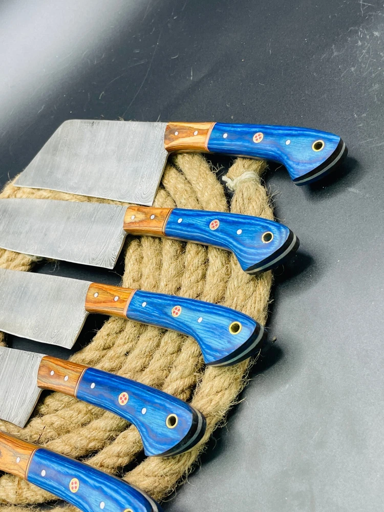 Introducing the Damascus Hand Forged Professional Kitchen 5 Pc Cutlery Chef Knife Set with Bag. This set includes a butcher knife, carving and slicing knives, cleaver, and chef's knife, all crafted from high-quality damascus steel. The knives feature a straight blade edge and a blue color, with a blade length of approximately 5-8 inches. The Wild Catco brand knives are perfect for deep frying, slicing through vegetables, fruits, and meats with ease. The set also includes a leather protective bag for safe and convenient storage. The knives are magnetic, multi-functional, and have soft grips for a comfortable hold. This set is a must-have for any professional kitchen or home chef. Blade material: Damascus Steel Knifes Length: Between 8-13 inches approximately Handle Material: Wood Knifes in Set : 5 Comes with Protective Bag DISCLAIMER: By Bidding / buying, you certify that you are 18 years of age or older and legally authorized to purchase this product in your country. We are not responsible for any injuries associated with the use of our tools. Our products are intended for legal use only by responsible buyers. Before bidding please check your country laws as some countries Custom don't allow this. If your purchase is held by Custom Authorities in your country we will not be responsible for that and no refund will be issued. CUSTOMER SATISFACTION: I’m confident that you will like my products as we struggle hard to provide you TOP QUALITY PRODUCTS. In case of problem please write me before leaving a negative feedback and I will absolutely resolve it. “Your satisfaction is my actual reward!” OUR GUARANTEE: The assurance in our quality allows us to offer you a 15 days money back guarantee. HOW TO TAKE CARE OF YOUR KNIFE: (1) Put a thin layer of oil or lubricant on the blade after each use. This procedure will avoid direct contact of moisture on the blade. Moisture helps the rusting phenomena. (2) DO NOT store it in leather sheath for a LONG period of time. Oil it and store it rather in a plastic bag.