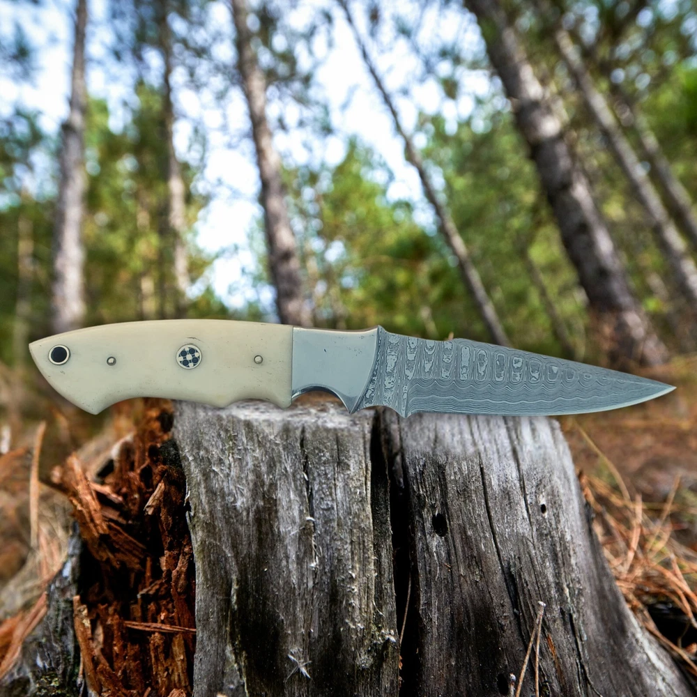 Custom Handmade Damascus Steel Blade Fixed Blade Hunting Knife with Bone Handle and Horizontal Carry Leather Sheath , Heavy Duty Skinner Knife , Bushcraft Knife PREMIUM DAMASCUS STEEL : Hand-forged blade featuring distinctive layered pattern, delivering exceptional sharpness and edge retention with Hardness 56 to 58 HRC . FULL TANG CONSTRUCTION : Damascus Steel Blade Made from 1095 high carbon steel and 15N20 Steels runs through entire handle length for maximum strength and durability during heavy-duty use OVERALL LENGTH: 9 inches or 23 cm total length with ergonomically designed camel bone handle for comfortable grip and precise control . Handle and Blade length is 4.5 inches or 12 cm . Blade thickness is 4mm HORIZONTAL CARRY SHEATH : Durably Stitched Premium vegetable tanned leather sheath included for convenient belt carry and easy access VERSATILE DESIGN : Perfect for hunting, bushcraft, outdoor, camping, and everyday carry tasks with its robust fixed blade design