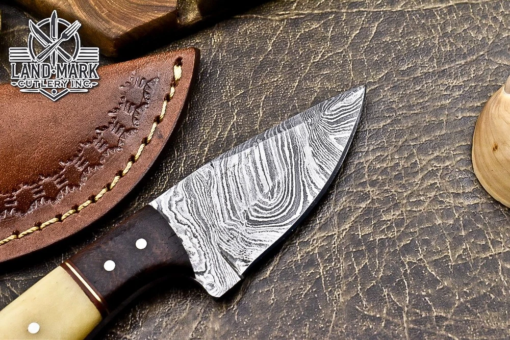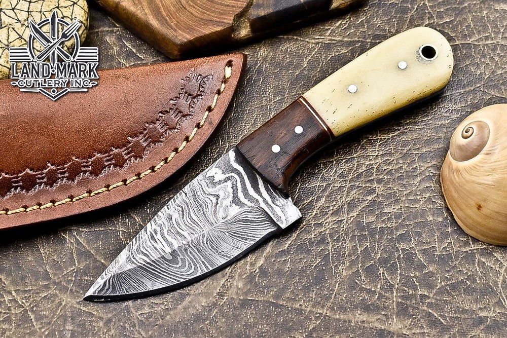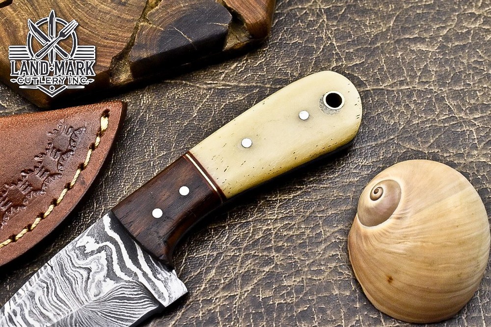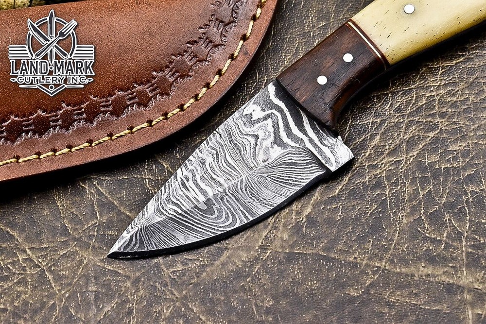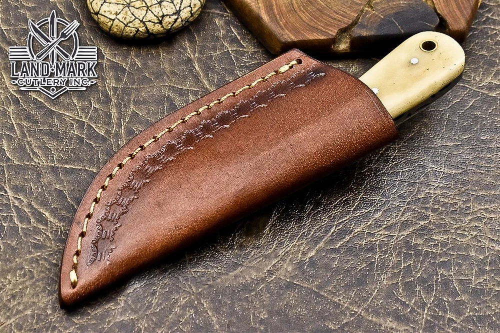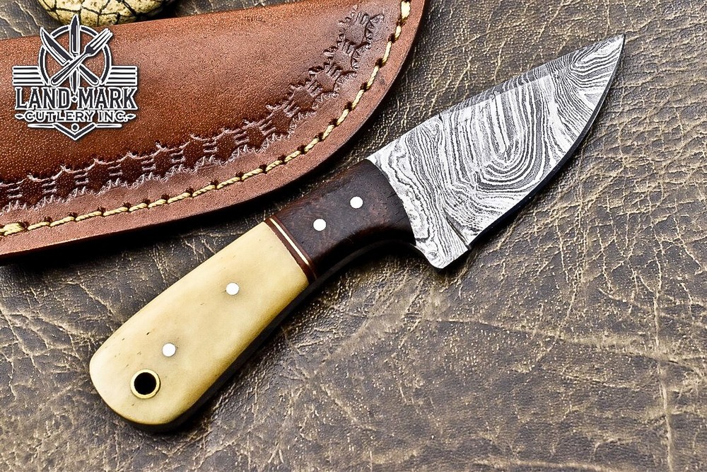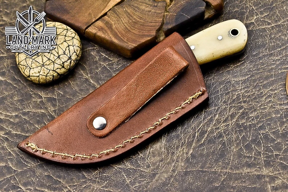 Custom Hand Made DAMASCUS STEEL HUNTING KNIFE WITH CAMEL BONE HANDLE We offer a shipping discount for More then one purchased . And discount will be apply on combine invoice, Discount will not apply on separate payment. ITEM DETAILS OVER ALL LENGTH 3.0 inches long (Approx) HANDLE LENGTH 1.5 inches long (Approx) BLADE LENGTH 1.5 inches long (Approx) BLADE HARDNESS 58-60 HRC Which Holds The Sharp Edge For Long Time. HANDLE CAMEL BONE COVER LEATHER SHEATH This Awesome custom made KNIFE has a nice hand forged with the combination of 4340 & 1080 steel. HOW OUR DAMASCUS IS MADE: All our Damascus is real and not just an acid etch. Damascus is a mixture of 1080HC and 4340 nickel carbon. You heat them up together and then fold the bar over and over to get the desired layers, ours are 396 layers. Then you burn the blade in acid, and it turns the nickel satin color and the high carbon turns blackish gray. This is how the layers are exposed to show the layers of the new steel created coined "Damascus". All Damascus is acid etched to show the layers. If you high polish the metal it will be shinny satin like all steels. Only after you burn the sides of the blade with acid do you see the layers of the two steels. Makes sense? After we make our knives we high polish the handles and put an edge on the blade. The high polishing buffs off the acid burned layer of the handle, and the blade edge is sharpened and the acid burned edge becomes satin. You can re-burn the tang of the blade near the handles and the edge of the blade and it will show the layers once more. All our knives are hand made, durable and unique ***** YOU WILL RECEIVED THE SAME KNIFE Qality Standards Our Damascus blades are made from high quality non-stainless steels which rival or exceed any Damascus blade made from the 10 series with 4340. Our Damascus combination has taken years to perfect and has been tested under a variety of application which will offer professional performance in categories of toughness, strength (lateral stress) and edge honing and holding ability. In a 5 spot Rockwell test our blades will average near or close to 58 which offers a perfect balances between its toughness and strength.Our blades due to carbon content need to be regularly treated with wax and/or 3 in 1 oil to maintain its superior quality. Questions if you have any question feel free to send us message we aim to answer all questions within 24 hours Feedback If you are not satisfied with our service please contact us before leaving any negative or natural feedback. We will resolve all issues as quickly as possible. Disclaimer We are not responsible for any injuries associated with the use of our tools. Our products are intended for legal use only by responsible buyers. Therefore, we will not sell our products to anyone under the age of 18. Before bidding please check your country laws as some countries Custom don't allow this. If your purchase is held by Custom Authorities in your country/State we will not be responsible for that and no refund will be issued Shipping We offer a 20% shipping discount for More then one purchased . And discount will be apply on combine invoice, Discount will not apply on separate payment We ship within 24 hours after receiving complete payment but this can be delayed due to week ends or Governments and Religious Festivals . . This is beyond our control and we apologize for this inconvenience. Precautions Our Tools are very sharp so open and use them very carefully We are not responsible for any injuries associated with the use of our tools Tips to Care knife 1. NEVER STORE YOUR KNIFE FOR LONG TIME IN LEATHER SHEATH. 2. LEATHER CAN ABSORB WATER, WHICH WILL RUST THE KNIFE. 3. ALWAYS CLEAN THE BLADE AFTER USING WITH OIL OR WAX