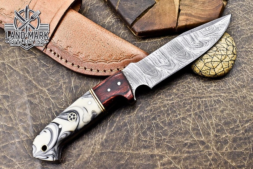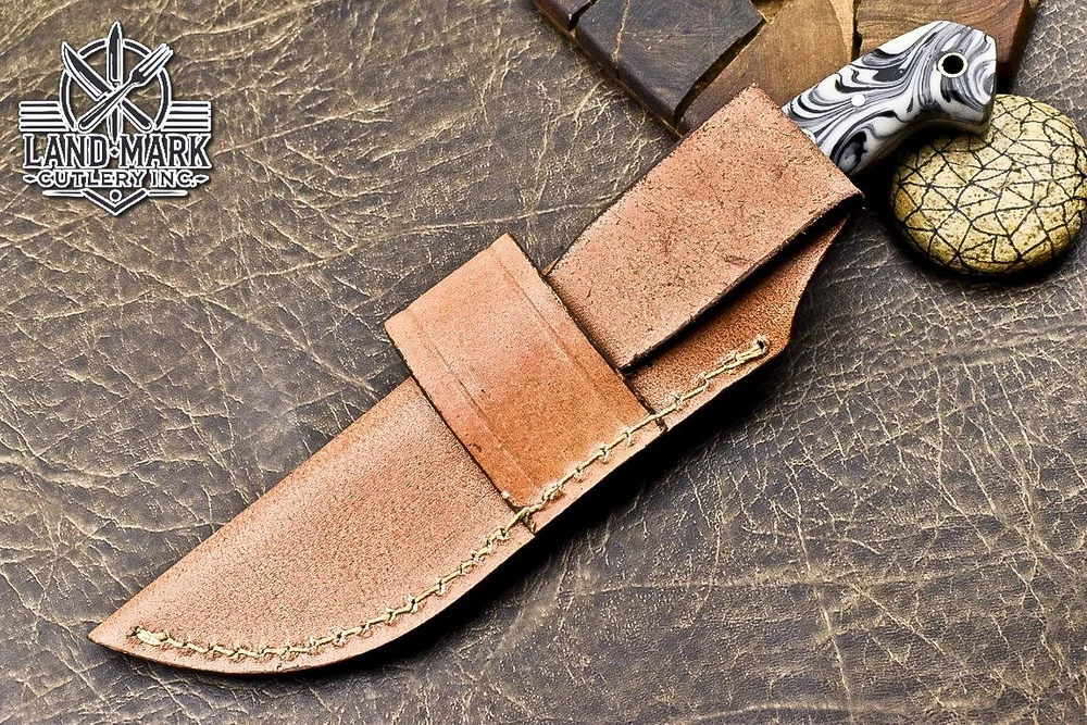 This knife is absolutely stunning! The Damascus steel blade is razor-sharp and holds its edge perfectly, while the white swirl resin handle adds a touch of elegance. The craftsmanship is top-notch—you can tell it’s hand-forged with care. It feels balanced and sturdy in hand, making it great for hunting or outdoor use. The leather sheath is a nice protective touch. Plus, the seller offers shipping discounts for multiple purchases. A must-have for any knife enthusiast!
