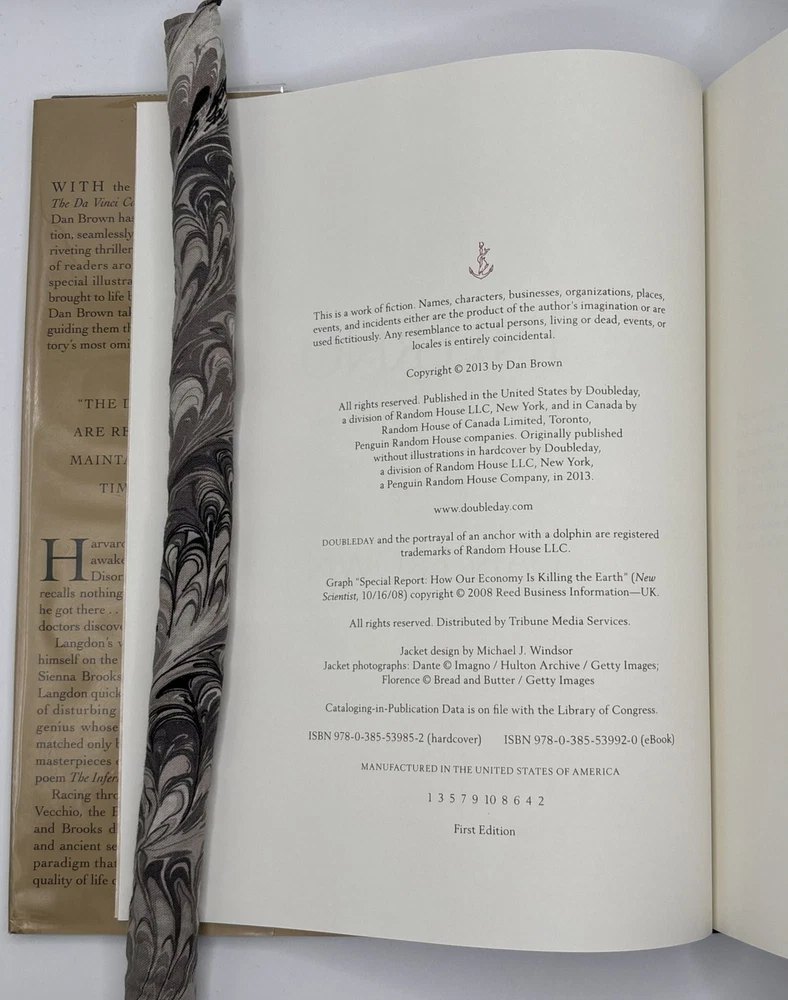 INFERNO [Signed] Author: Brown, Dan Title: INFERNO [Signed] Publication: New York, New York: Doubleday, 2013 Edition: First Illustrated Edition, First Printing Description: Large octavo, 477 pages. In Very Good condition with Very Good condition dust jacket. Spine is tan and orange with gilt and white lettering. Dust jacket protected by mylar covering, price uncut: "$40.00" on front flap, has circular gold sticker adhesively affixed to front cover and mild creasing along spine tail and rear tail joint. Boards have mild shelving wear along extremities. Signed flat by Dan Brown on tipped in page. Shelved in hallway. Seller ID: 1392318 Subject: Literature Welcome to the eBay store of Second Story Books! DC's Oldest Rare and Used Bookstore, Second Story Books operates two open shops in the Washington D.C. metropolitan area. We have an extensive internet presence and provide accredited appraisals member ASA. This listing was created by Bibliopolis.