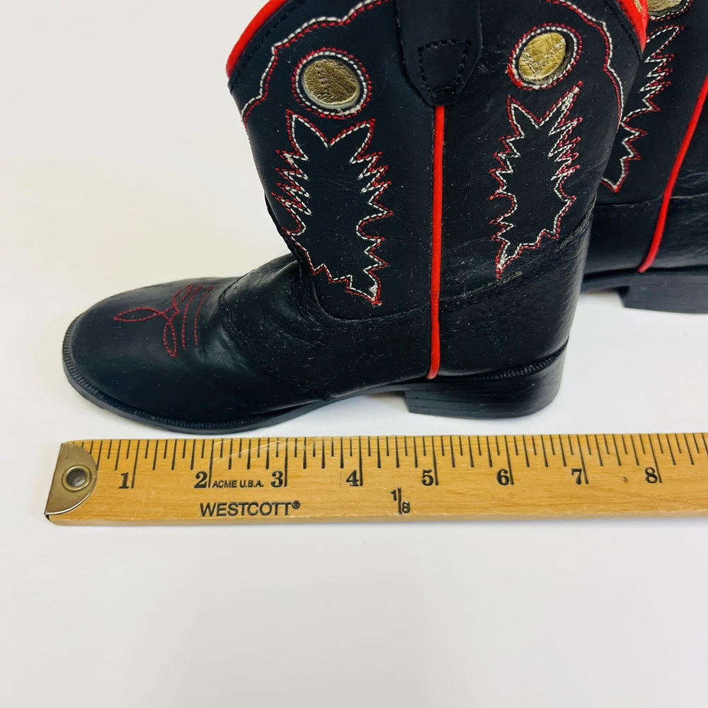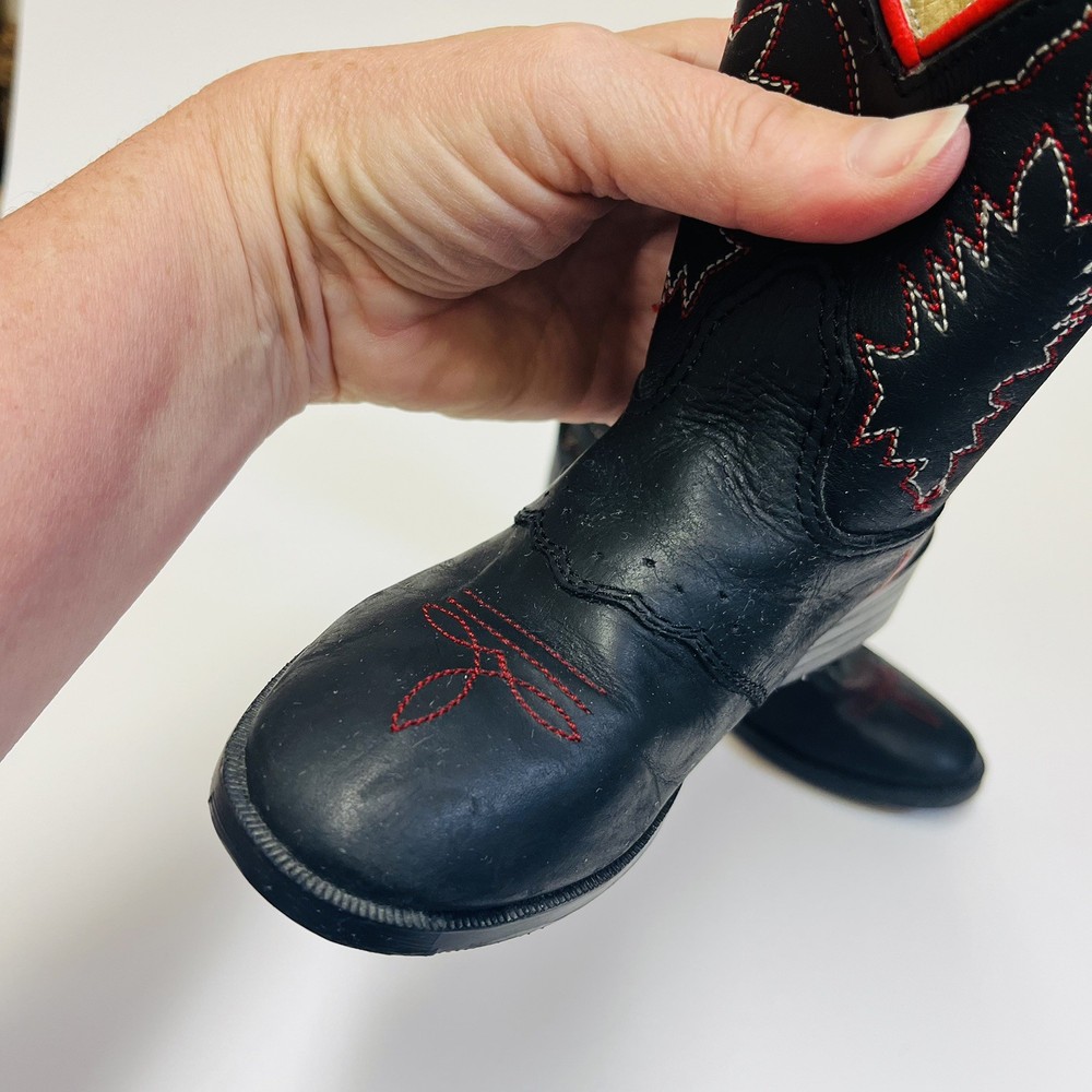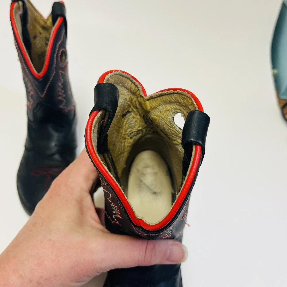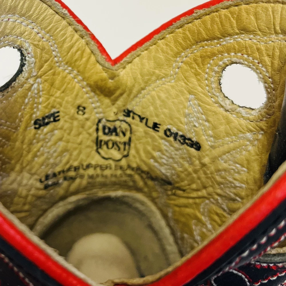 Dan Post Kids Youth Roper Western Cowboy Leather Boots Black w/ Red Detail and Embroidery Children’s Size 8 Worn Once Inside! All the Good Details in a Pint Size! Color: Black with Red Size: Child's 8 Material: Leather Upper Manmade Sole- See picture for Full Fabric content Condition: Good, No visible Stains or Flaws * Product color may vary slightly due to photographic lighting or your monitor settings. THANK YOU FOR YOUR INTEREST! WE SHIP WITHIN 2 DAYS OF PURCHASE ALL RELEVANT PHOTOS ARE IN THE LISTING WILL NOT RESPOND TO MESSAGES FOR ADDITTIONAL PHOTOS OUTSIDEOF THIS APP!!! PLEASE DO REACH OUT IF THERE IS SOME SPECIFIC DETAIL YOU ARELOOKING FOR AND WE WILL UPDATE THE LISTING WITH AN ADDITIONAL PHOTO IF POSSIBLE